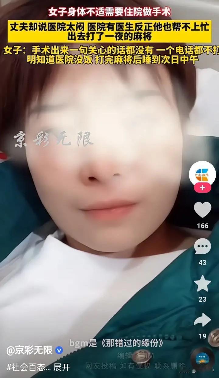这婚结得还有啥意思!女人身体出问题要住院开刀,丈夫撇撇嘴说医院闷得慌,有医生在他也帮不上忙,转头就去搓了一夜麻将。 女人手术完躺在病床上,没等来一句关心,连个电话都没有。明知道医院没饭吃,丈夫打完麻将竟直接回家,睡到第二天中午才醒。 隔壁床大姐看不下去,帮她打了碗粥。女人咬着勺子,眼泪吧嗒吧嗒掉进碗里,愣是没吭一声。病友们在一旁窃窃私语,都说这男人心太狠,摊上这么个主儿,往后日子咋熬。女人听见了,只是把头扭向窗外。 傍晚丈夫总算来了,手里拎着袋油腻的包子,张口就抱怨医院停车费贵。女人没接包子,也没抬头。丈夫反倒急了,嚷嚷着不就玩了一宿麻将,至于摆冷脸吗。 这话戳得女人心口发疼,她猛地推开粥碗,碗摔在地上发出脆响。丈夫的骂声跟着响起,周围的目光全聚过来。女人忽然觉得,心里的疼比刀口还钻心。出院那天,她没叫丈夫来接,一个人拎着行李走在阳光里,突然就想通了,这日子该换个活法了。
