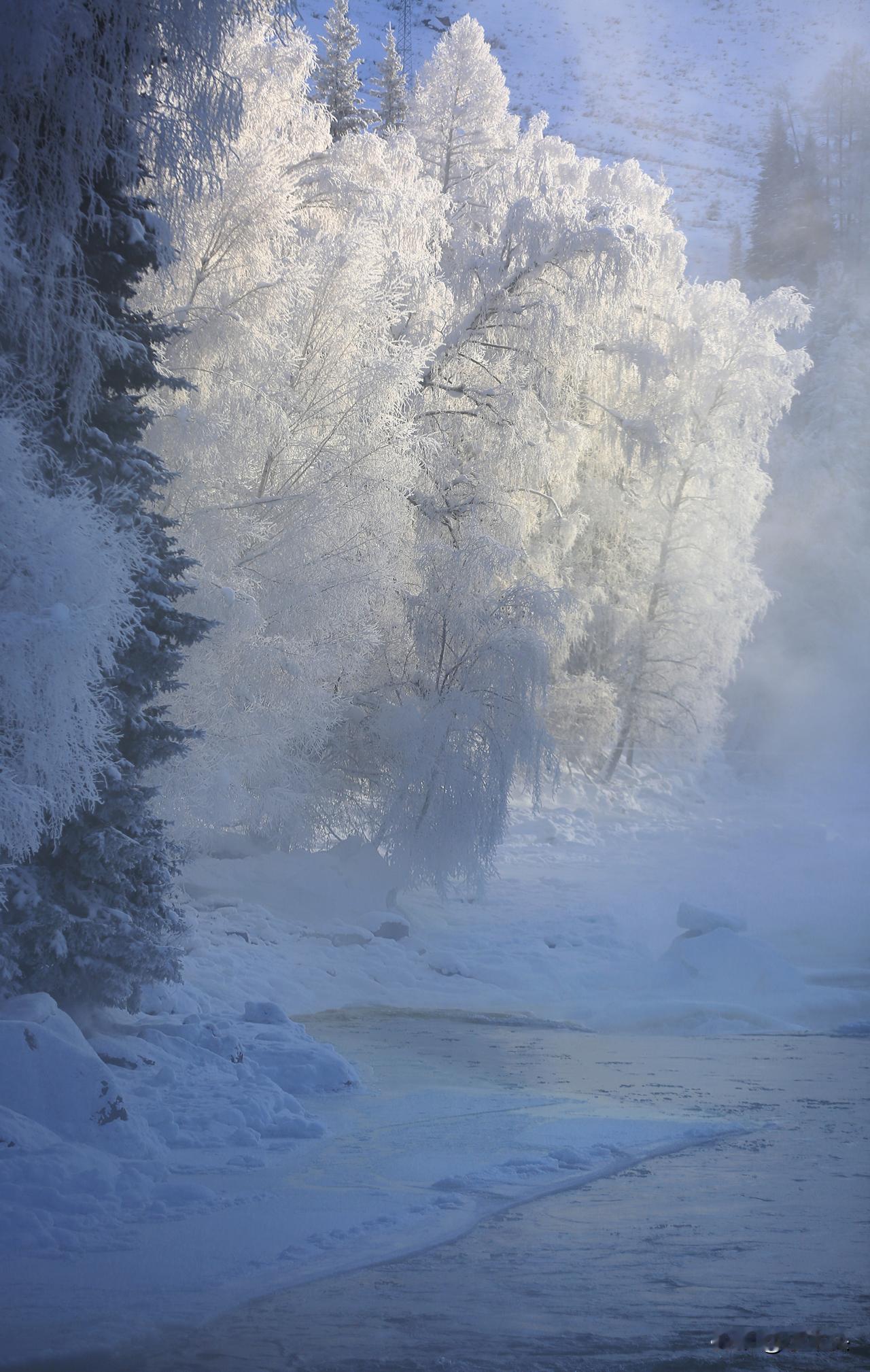会,我已经站在这里。 当大多数人还在讨论“值不值得”,我已在1月17日抵达阿勒泰,并亲历了1月19日那场零下47度的极寒考验。是的,你没看错,是零下47度,一个呼吸成冰、睫毛凝霜的数字。 为何非要此时来? 因为真正的极致美景,往往藏在最严苛的自然条件之后。当强冷空气席卷而过,阿勒泰展现的已不再是寻常的冬日温柔,而是一种极具侵略性的、近乎非人间的冷艳: · 冰雾弥漫的幻境:极端低温下,空气中的水分凝结成细小的冰晶,形成罕见的“冰雾”。远山、森林、村庄在弥漫的冰雾中若隐若现,宛如褪色的水墨画,又像沉睡的异星世界。 · 极致蓝调与银白:冷空气过滤了所有杂色,天空呈现一种深邃、纯净的宝石蓝,与大地无边无际的、闪着微光的银白形成强烈对比,视觉极为震撼。 · 万物静止的雕塑感:河流的奔腾被瞬间封印,波浪化作凝固的玉带;树枝被厚重雾凇包裹,每一根枝条都成为精雕细琢的艺术品。时间仿佛被冻结,天地间只剩下风雕刻世界的声响。 · 挑战自我的生命力:在这样极致的严寒中,每一次呼吸都带着刺痛,却能让人无比真切地感受到生命的热度在体内奔涌。这是一种与自然最原始力量的对峙与共存。 给勇者的建议: 1. 装备是铠甲:必须是专业级防寒装备。加厚羽绒服、防风防水外层、防寒面罩、加绒雪地靴、厚手套、雪镜,一样都不能将就,备足暖宝宝,包括暖足贴。 2. 电子设备:手机、相机电池在户外会急剧掉电,必须贴身保温,并准备充电宝,并给手机贴上暖宝宝,否则很容易死机。 3. 敬畏与安全:切勿单独远行,必须熟悉当地路况与天气预警。暴露皮肤在零下47度中几分钟就可能冻伤,安全永远是第一位的。 4. 寻找最佳观景点:喀纳斯湖、禾木村、白哈巴在极寒下幻化出不同往日的面孔。提前了解冰雾易形成的地形(如河谷、湖边)。