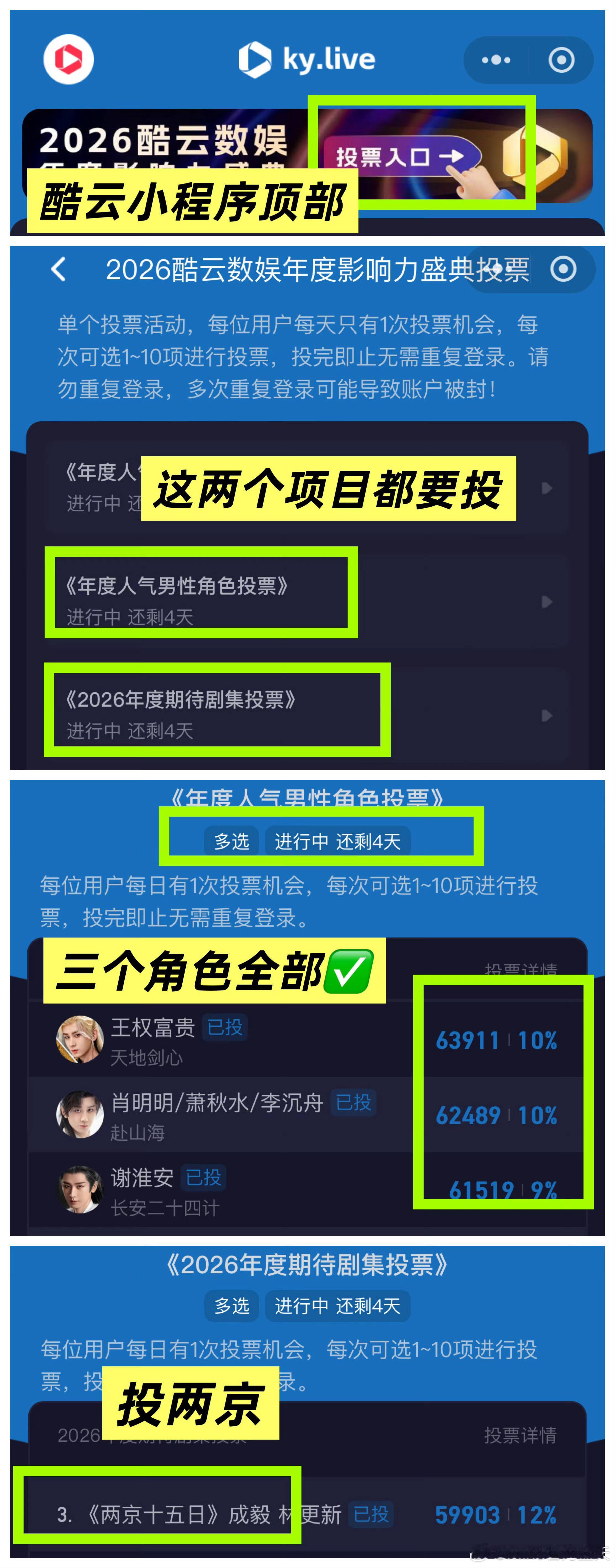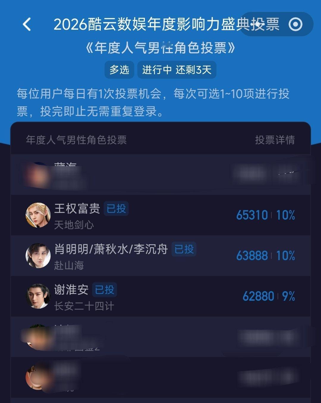 酷云投票已投——成毅未播剧《两京十五日》,以及谢淮安,王权富贵,肖明明,人气男性角色。(爱哭的孩子有奶吃,你倒是说需要我投票啊!)