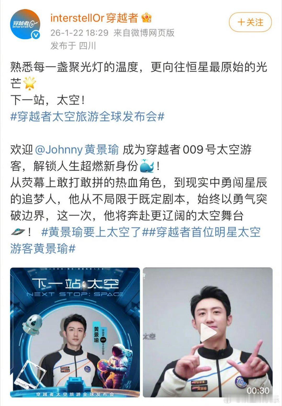 黄景瑜你是真的要上天啊 荧幕硬汉跨界太空人!黄景瑜官宣成中国首批商业航天太空游客,娱乐圈首位,2028年乘穿越者壹号闯亚轨道,真的要奔赴星海了!