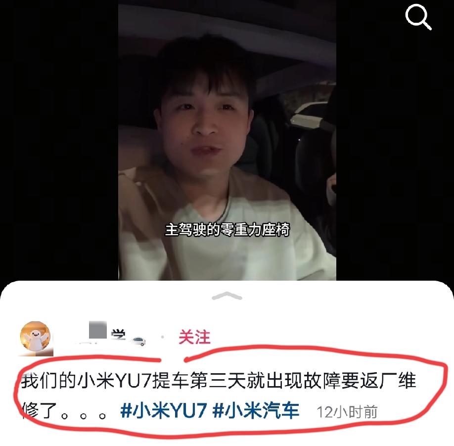 广东,小米yu7车主发视频吐槽:我们的小米yu7提车第三天、才开了60公里,就出现了故障要返厂维修了。家人们,帮帮我吧。 据这位车主说,他是零重力座椅这一块出现了故障。 可这位车主提车当天还说“座椅特别舒服”。 目前,这个吐槽的视频在他的账号里面已经找不见了。咱也不知道是怎么回事,反正我早上还有看到这个视频。