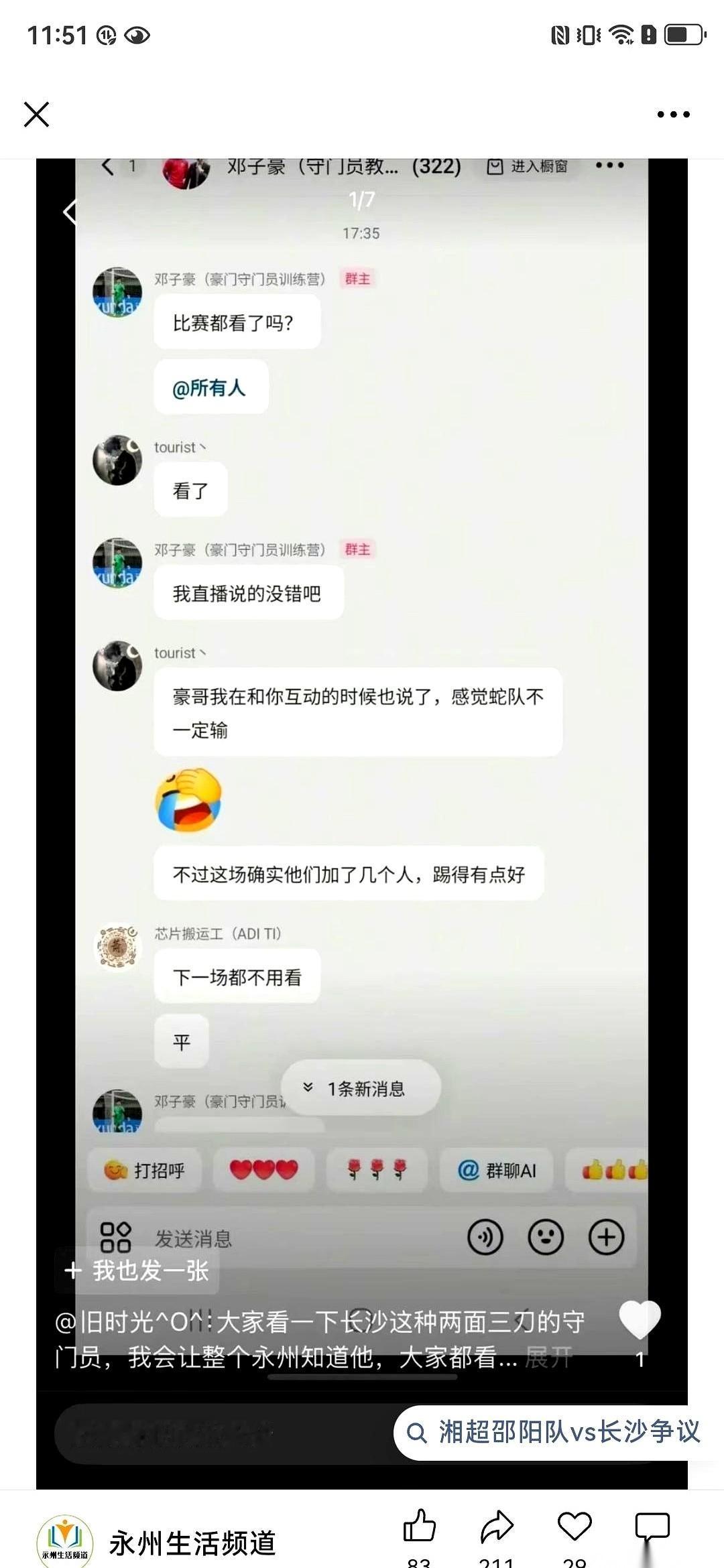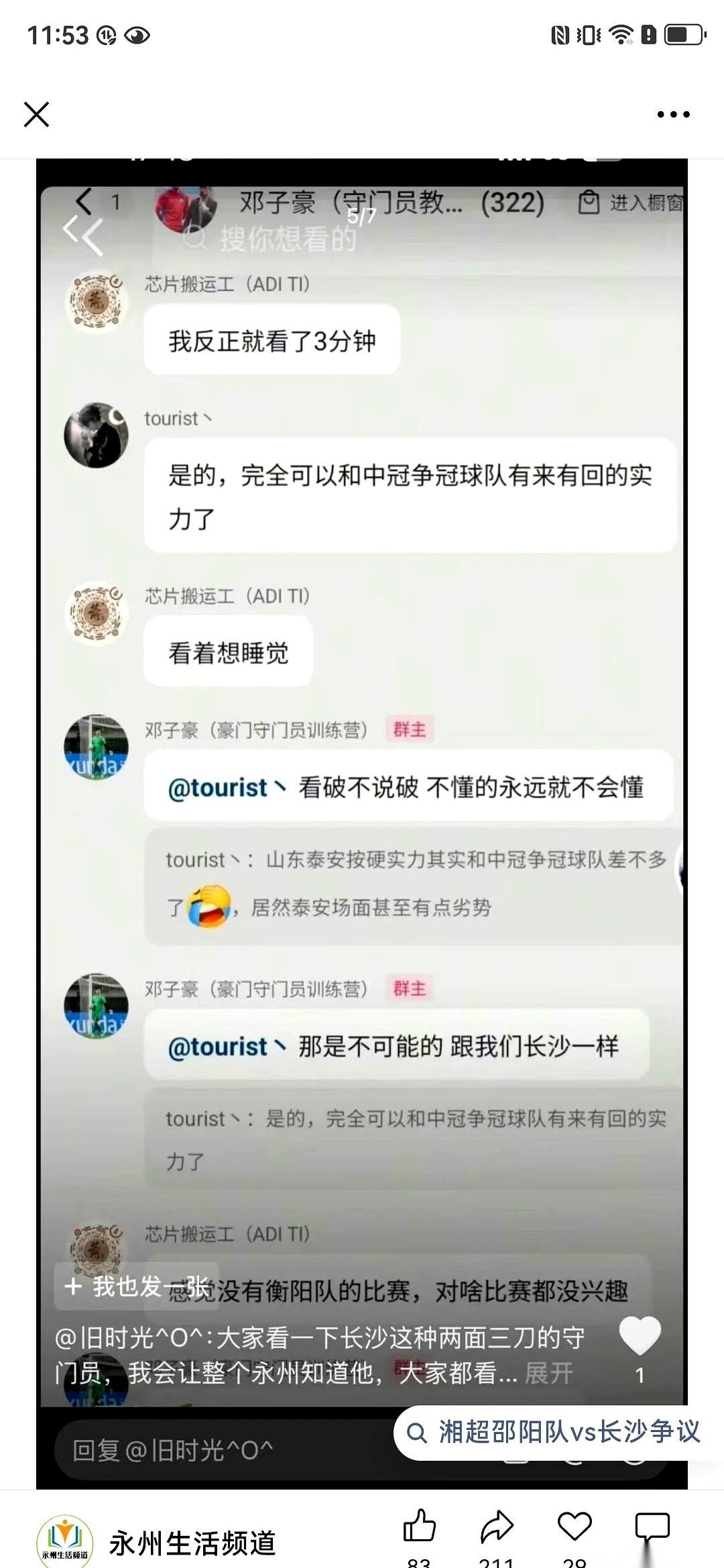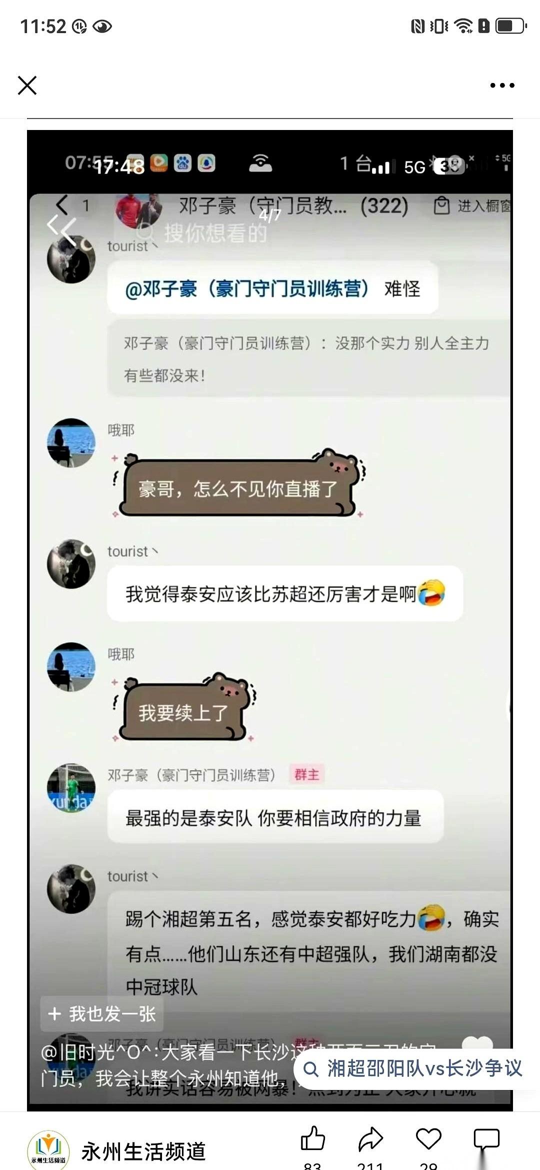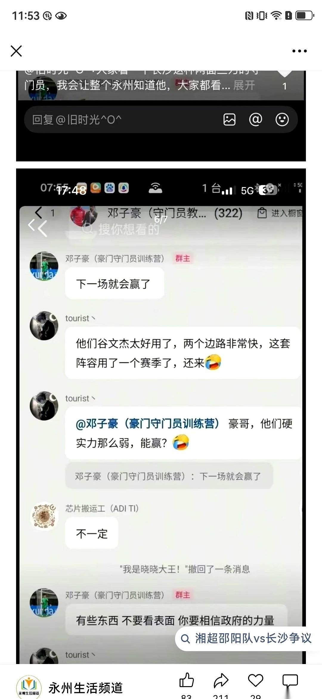 长沙队那个一号门将,邓子豪,几句话就把天给捅破了。 他在跟粉丝聊天,没有任何铺垫,直接扔出一句:永州队踢的是假球。 粉丝还没反应过来,他下一句更猛:政府主导的。 他点出的那两场比赛,一场平泰安,一场胜哈尔滨,就这么被他轻飘飘地打上了“安排好”的戳。这几个字,像块石头砸进水里,没听见响,只有聊天截图开始在各个群里疯狂地传。 最要命的是,他说的这个比赛,叫“冠超”,主办方,是央视和体育总局。 一个现役球员,公开点名一支冠军队,指控的不是裁判,不是对手,而是政府和最顶层的办赛机构。 这事儿就怪在这。 如果他说的是假的,那他一个人,是拿自己的整个职业生涯在开玩笑。 如果他说的是真的呢?