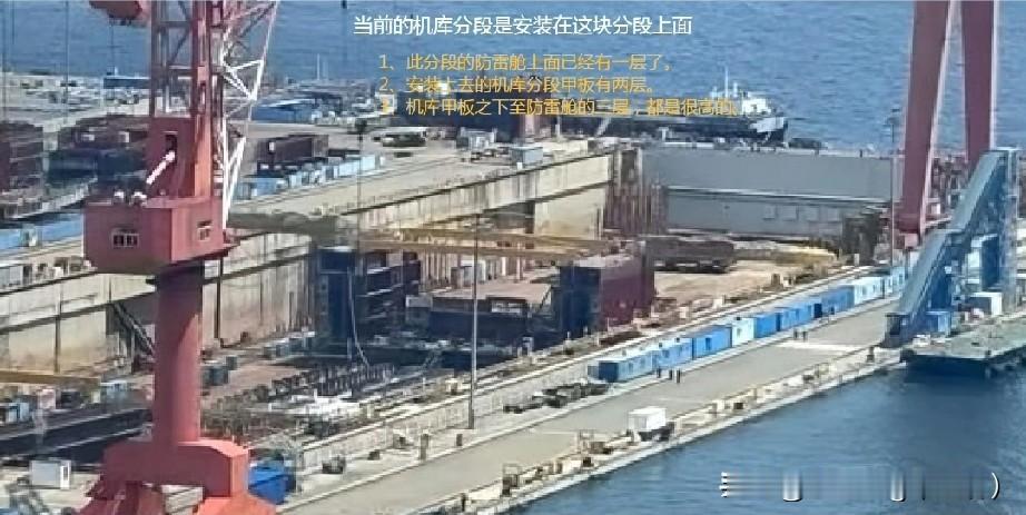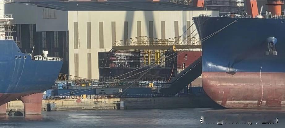 最新亮相的机库分段直接亮出两层机库甲板和两层侧壁,而且机库甲板的单层层高明显比侧壁层高更充裕,后续还会在侧壁上方加装带飞行甲板桁架结构的“秃宝盖”分段,外倾的机库侧壁设计和003型保持一致的成熟思路。 此前船坞中间的分段已经自带一层高规格机库甲板,现在新的机库分段正稳稳安装在上面,三层机库的布局雏形已经很清晰。 这款航母的型深预估能达到33米,比福特级高出2到2.5米:防雷舱设计规格高、吃水更深,三层机库甲板本身就需要充足空间,动力组的整体高度更大,自然得预留足够安装空间,再加上31.5米宽的舰艏额头——比福特级宽了6米,必须多高出一层的高度才能维持结构强度,不然外扩弧形太大会影响舰体稳定性。 一直以来咱们都讲究兼容并蓄、取长补短,从不局限于美式或苏式的固有框架,而是吸收精华、规避短板,走出自己的路子。