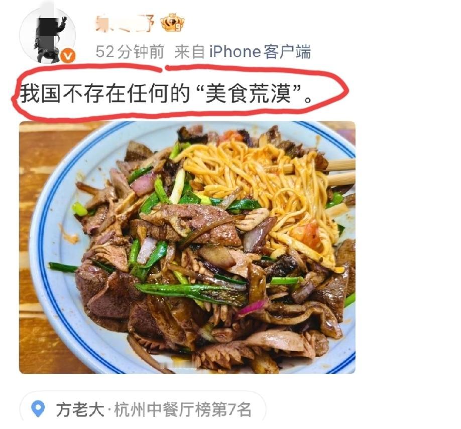 著名音乐人发文:我国不存在任何的“美食荒漠”。并附上了一张杭州一网红餐厅所做的一份面食的图片,这碗面应该是“猪肝腰花拌川”。显然,这位知名音乐人意图通过此文为“杭州美食”正名! 此文一发,立刻引得众多网友的共鸣,大部分网友现在已经基本达成共识:所谓的“杭州是美食荒漠”的说法简直就是瞎扯,是那些重口味地区对杭州美食的偏见。可能这里面还带着一些的“阴谋论”,这样可以让他们这些地区的麻辣火锅、铁锅炖等等取代杭州当地美食在餐桌上的地位! 评论区诸位网友,你们觉得呢?