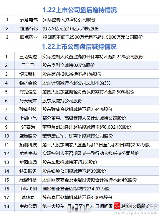 1月22日增减持汇总a股
