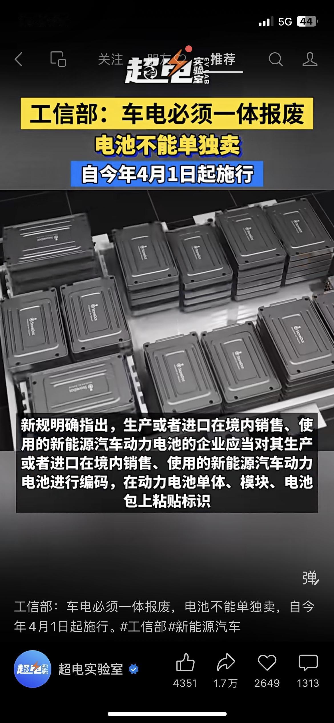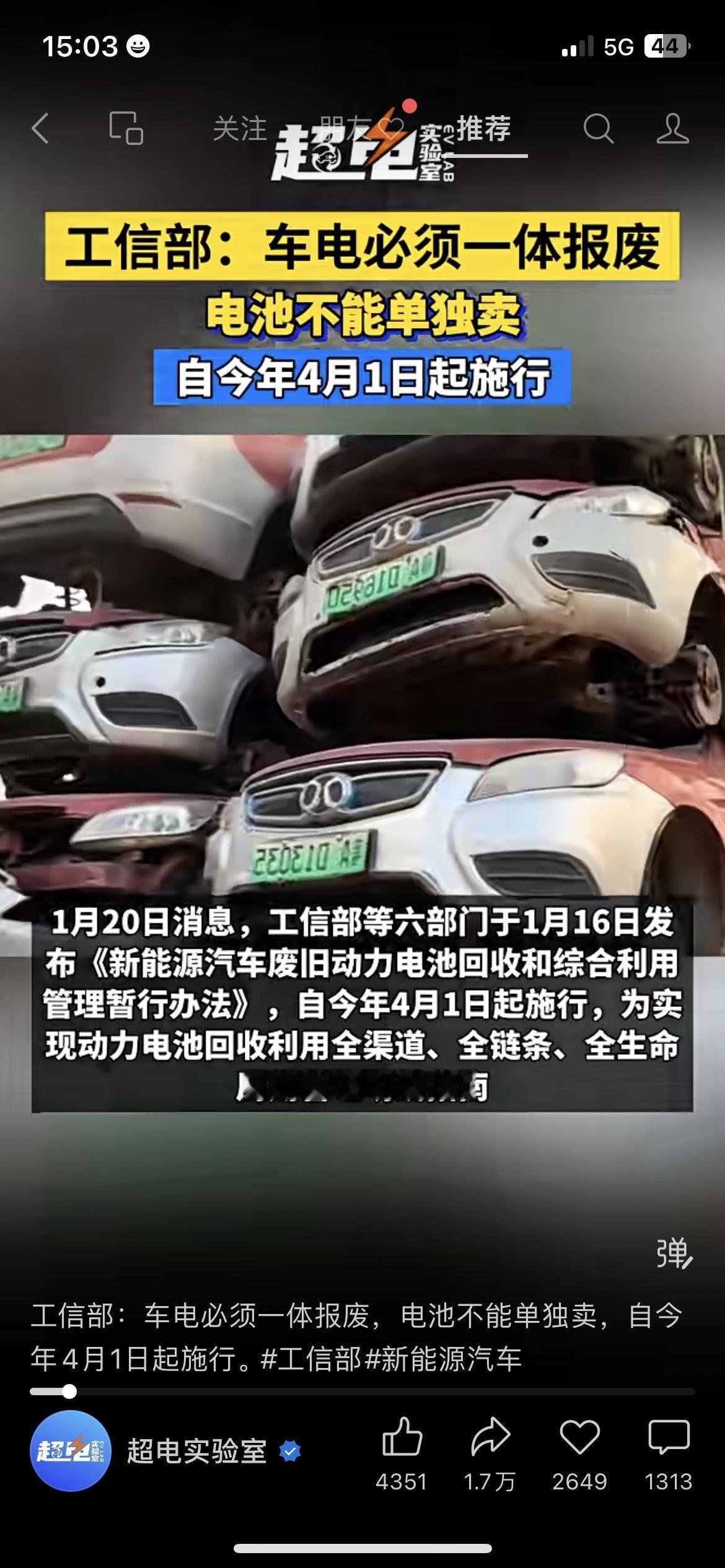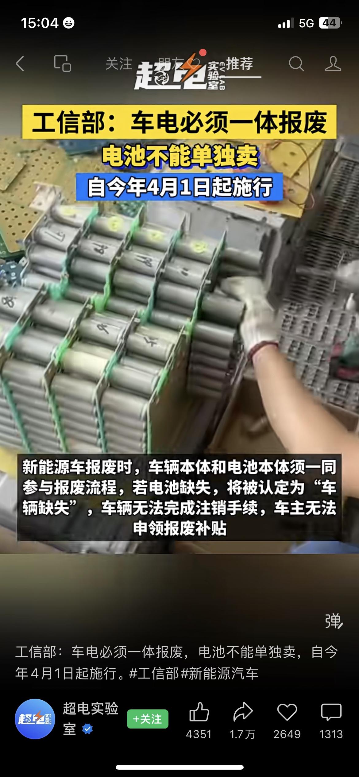 新能源车主要注意!4月起车电必须一起报废 我表哥去年刚把旧电车的电池拆下来卖了,现在新规一出,他车都没法报废领补贴!4月1日起,新能源车报废时电池不能单独拆卖,车电必须一起走流程,缺了电池连注销都办不了。 政策不是为了卡你,是为了让每块电池都能安全回家。 你家有旧电车吗?打算提前处理还是等新规落地? 新能源车报废 民生热点