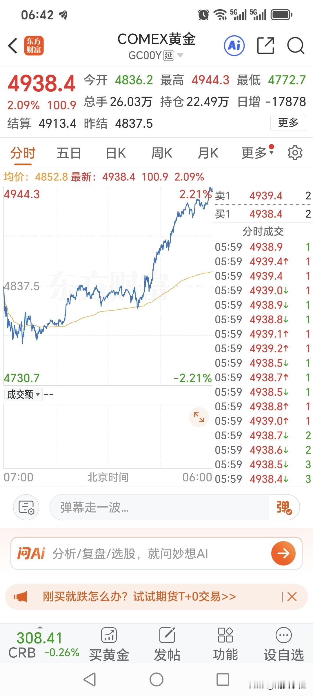 昨日国际金价大幅飙升, 站上四千九百美元。 周四国际金价开盘4836.2美元, 盘中最高升至4944.3美元, 最低跌至4772.7美元, 最终收盘于4938.4美元, 较上一日上涨100.9美金, 涨幅2.09%。 对于飙升的金价, 期货小褚无言以对, 只能如朝拜仙人一般,仰望!