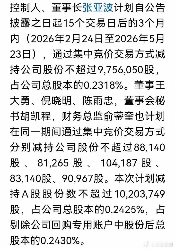 恭喜各位股民朋友,著名浙江科技企业,上市公司,人形机器人龙头三花智控用不了多久也将成为你们的啦。三花智控实控人于1月22日公告,三月内减持975.61万股,按现价测算将套现5.47亿元,减持原因为个人资金需求。此前已减持2003.7万股,套现5.6亿元,此人原持股为5002万股。另外,其他董事及董秘五人也将于同期减持共计1020.3万股。我就特别不明白了,一个1994年创立的企业,2005年上市至今已20年,是多大的付出与坚持啊,如今竟然清仓式减持了,而且是在其人形机器人的产业人声鼎沸之时,董监高集体减持,让人以为是集体大逃亡呢。A股的股民该成立个超级企业集团了,因为现在接盘的被实控人清仓式减持的企业大概已不止上百家了。
