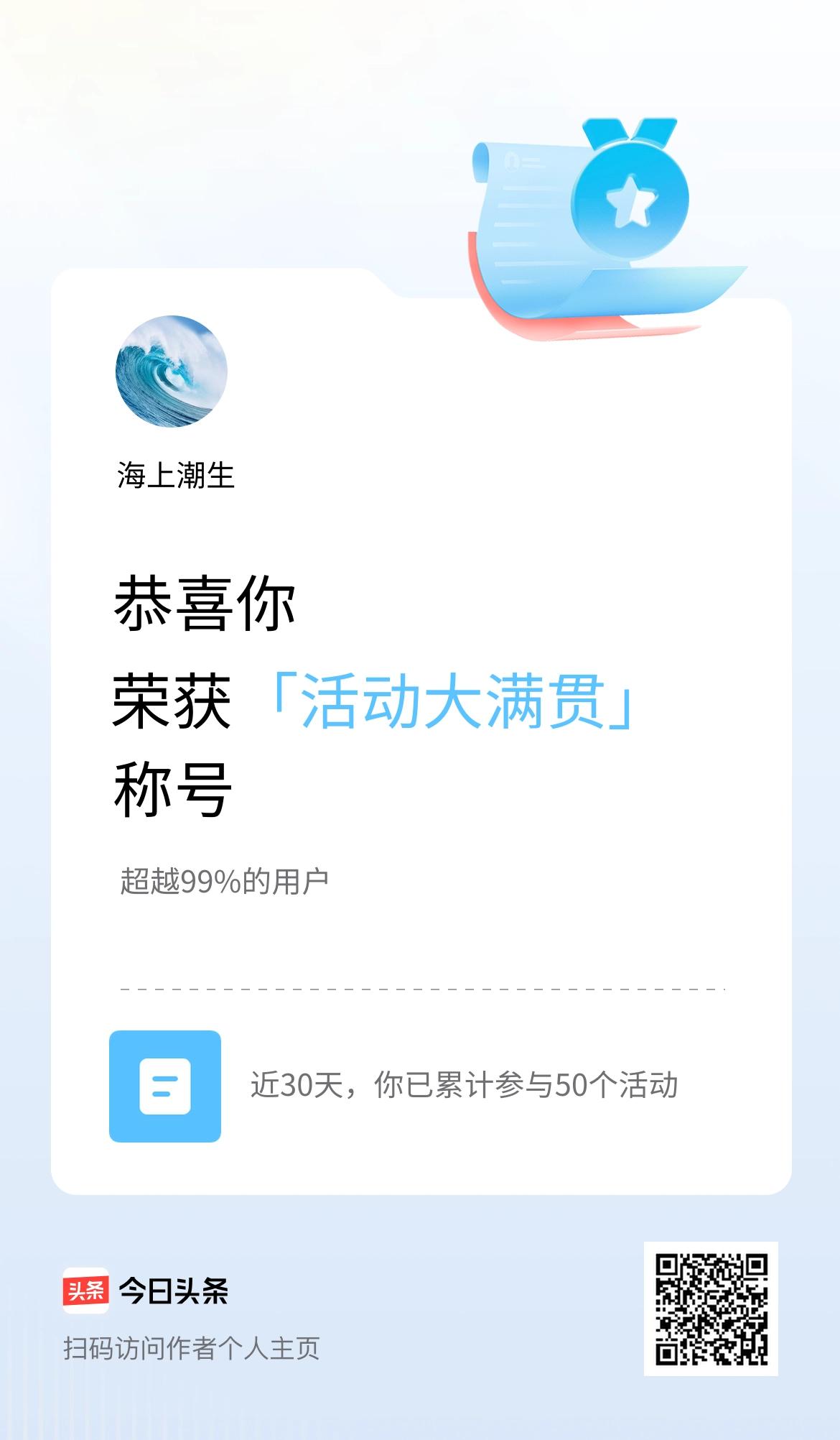 要是平台不说我都没想到,原来我在过去的30里参与了50个活动,并获得“活动大满贯”称号。 说到“大满贯”,让我立刻想到张继科、马龙、樊振东,因为我喜欢乒乓球。所以,我特别喜欢这个称号,对我是一种激励,还要再接再厉。 同时,我也想起一年前甚至更早些时候,还有几位网友,我们曾一起参与活动,不知道他们现在忙些什么,因为他们已经断更了。 记录我的2026