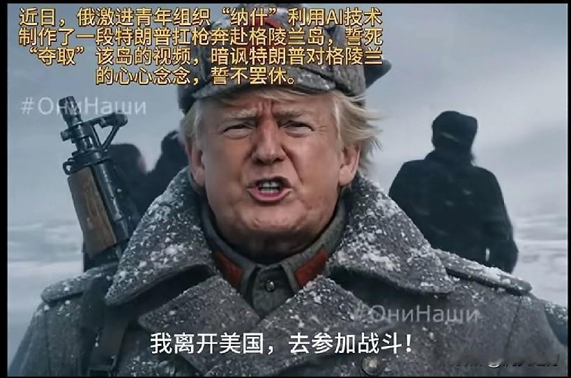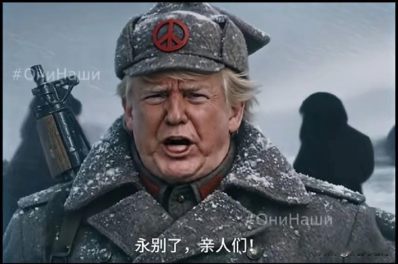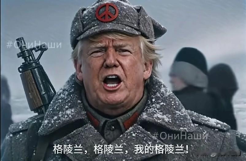 搞笑版:川普视死如归上战场誓夺格陵兰! Прощай, родные! Я уезжаю из США, чтобы сражаться!) Гренландия, Гренландия, моя Гренландия! 这帽徽是简化版五粮液标记,网友:那地方特冷,喝点白酒御御寒。[捂脸]