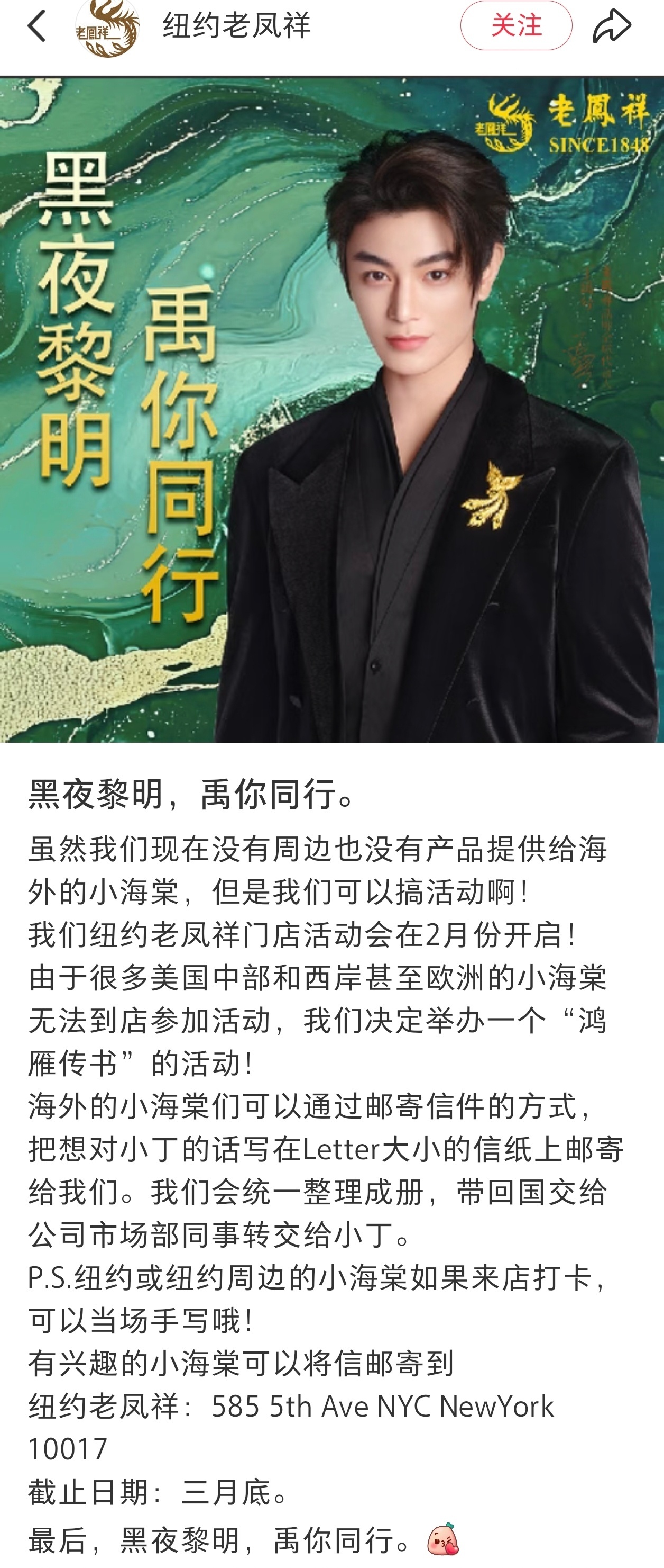 翻译一下老凤祥的意思:“没有周边也没有产品”提供给海外小海棠,但是你们可以通过纽约的店面把信交给我们,我们帮你们装订成册,我们亲自给你们送到丁禹兮手里”对的,就是老凤祥替小海棠去和丁禹兮贴贴