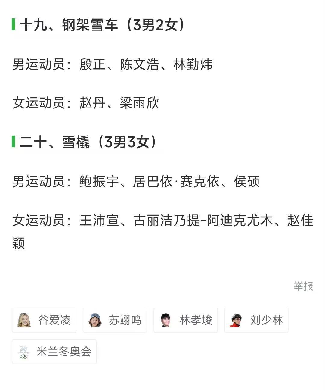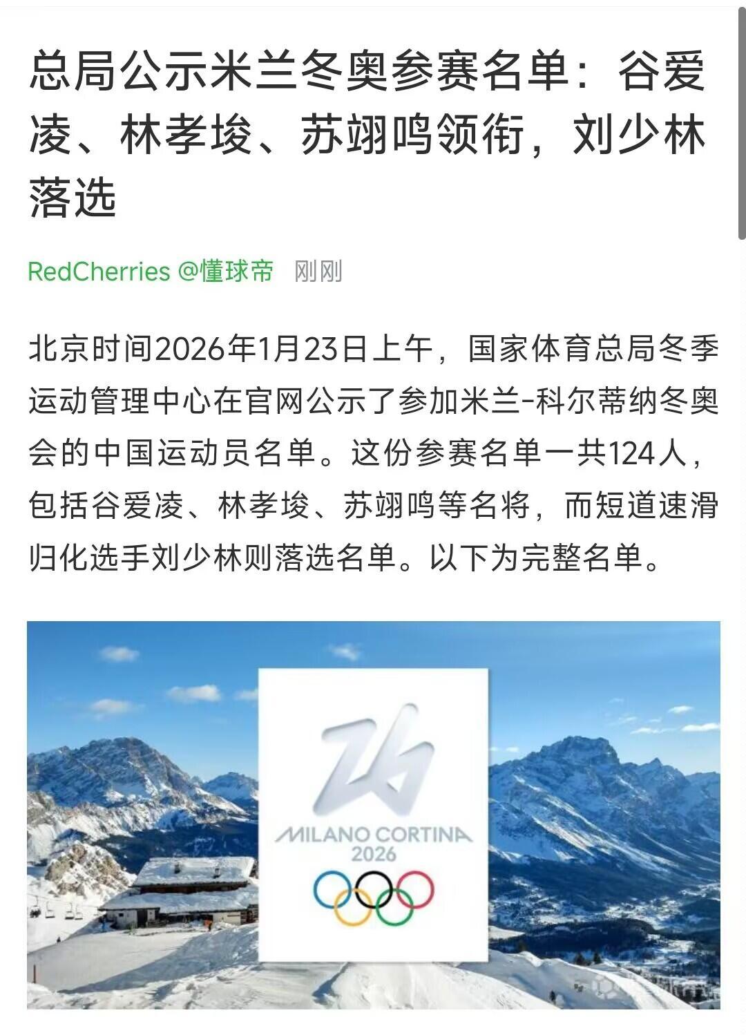 米兰冬奥运动员公示米兰冬奥中国124人参赛名单出炉!谷爱凌三线冲金、苏翊鸣单板逐梦、林孝埈短道领衔,熟悉的身影皆在列,满心期待赛场名场面。可惜短道速滑归化选手刘少林遗憾落选,本赛季状态下滑无缘出征,多少有点意难平。愿出征健儿稳扎稳打,也盼落选者不留遗憾,冰雪征程未完待续~2026米兰冬奥会为中国冰雪加油微博冰雪季