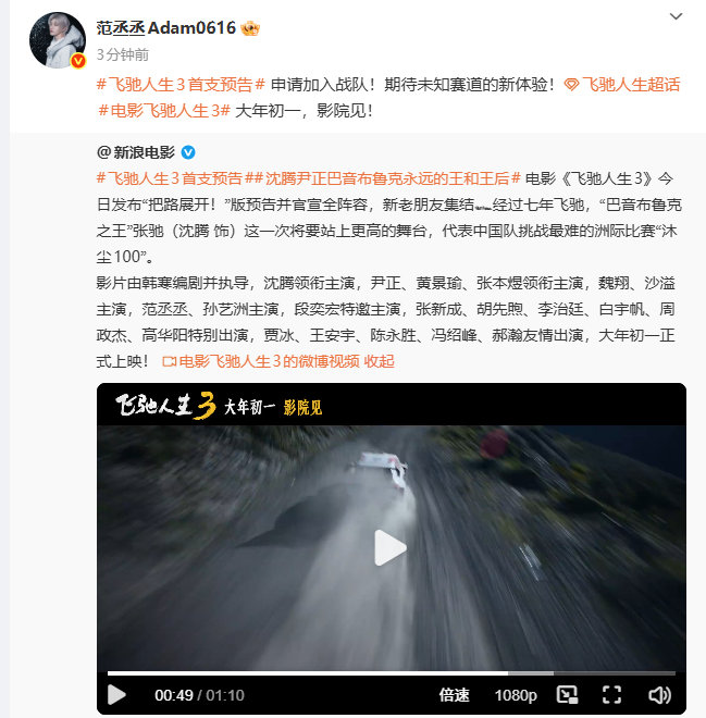 范丞丞大年初一影院见飞驰人生3七年飞驰 范丞丞大年初一影院见,飞驰人生3七年飞驰,这一次终于要集结一起,代表中国队挑战最难的洲际比赛“沐尘100”。燥侯和你们的影院的见面啦~