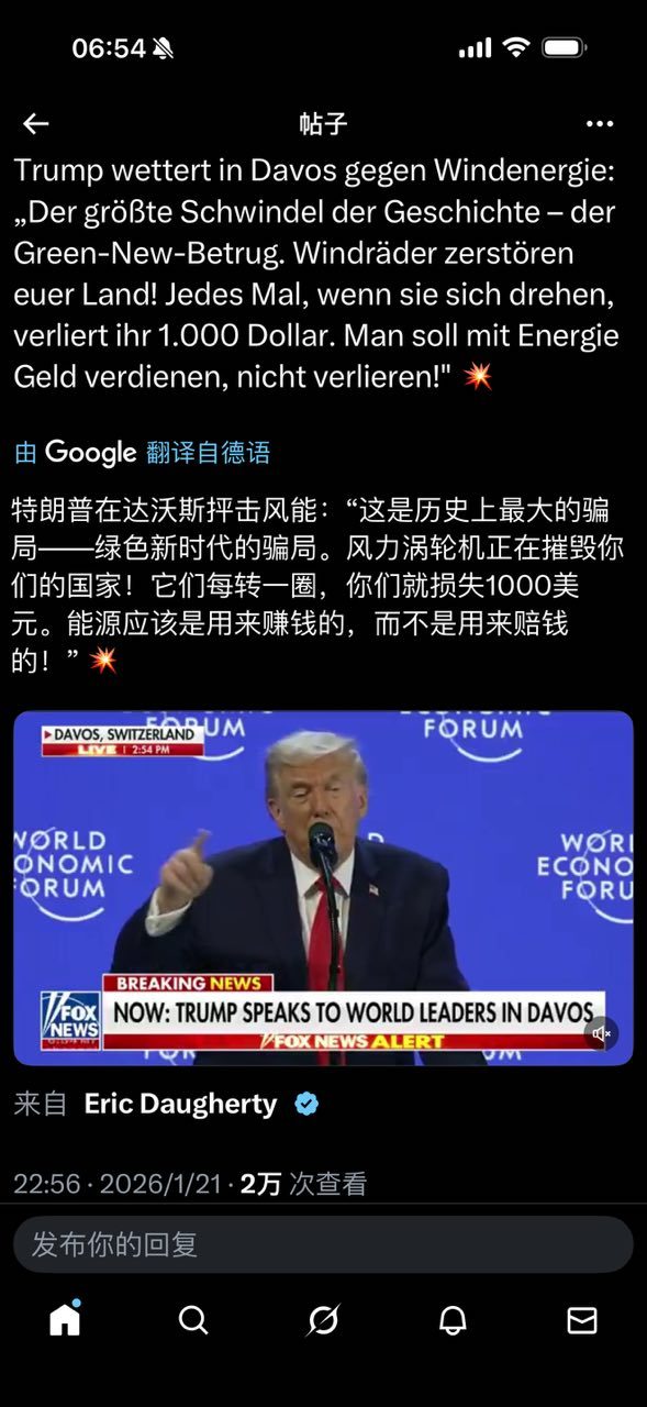 特朗普在达沃斯抨击风能:"这是历史上最大的骗局﹣﹣绿色新时代的骗局。风力涡轮机正在摧毁你们的国家!它们每转一圈,你们就损失1000美元。能源应该是用来赚钱的,而不是用来赔钱的!"