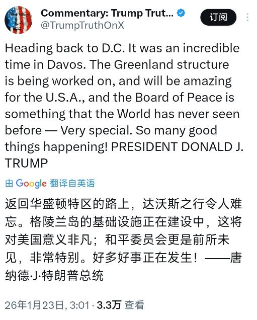 特朗普今天(北京时间1月23日)写道:“返回华盛顿特区的路上,达沃斯之行令人难忘。格陵兰岛的基础设施正在建设中,这将对美国意义非凡;和平委员会更是前所未见,非常特别。好多好事正在发生!” 要知道,就在他去达沃斯之前,还没少放狠话,甚至直言不讳地说控制格陵兰岛对美国国家安全是“绝对必须”的,当时不少人都以为这只是商人出身的他惯用的谈判策略,想以此作为筹码去压一压丹麦或者欧洲的价,可现在看来,这事儿远没那么简单。 你看他这回特意强调“基础设施正在建设”,说明他不仅关注岛上的资源,更看重那里的地缘战略价值,格陵兰岛那地方位置太关键了,扼守着北极航道,又是连接北美和欧洲的跳板,岛上还有丰富的稀土矿产,谁控制了那里,谁就在未来的大国博弈中占据了主动。 他这趟达沃斯之行,表面上是在世界经济论坛上大谈美国优先,跟各国政要寒暄,实际上心思恐怕早就飞到了那片冰雪覆盖的大岛上了,这会儿回程发这个感慨,无非是想告诉外界,他已经盯上那块地了,而且正在认真考虑怎么把它弄到手。 对于丹麦和欧洲来说,这绝对是个棘手的难题,格陵兰岛虽然高度自治,但在外交和防务上还是归丹麦管,特朗普这么明目张胆地表达兴趣,甚至暗示某种“必要性”,无疑是在试探丹麦的底线,也在观察国际社会的反应。 之前丹麦国王甚至紧急修改了国徽,把格陵兰岛的图案突显出来,以此宣示主权,这种外交上的小动作虽然看着挺无奈,但也说明欧洲人对特朗普这次是认真的感到害怕,毕竟美国真要是动起真格来,不管是经济施压还是军事威慑,小小的丹麦根本招架不住。 美国那边现在也是两极分化,一部分人觉得特朗普这是在瞎折腾,没事找事,会破坏美欧盟友关系;但另一部分战略派却很支持,认为从长远看,控制格陵兰岛能巩固美国在北极的霸权,遏制俄罗斯在那里的扩张,也能盯着中国在那里的科考活动。 特朗普这会儿提“基础设施建设”,其实是个很聪明的切入点,因为格陵兰岛确实缺钱缺设施,美国如果打着投资建设、改善民生的幌子进去,搞不好就能形成“既成事实”,慢慢把影响力渗透进去,最后让当地人觉得跟着美国混有肉吃,从而主动倒向华盛顿。 而且他这性格大家都清楚,不做亏本买卖,说“对美国意义非凡”,那背后的潜台词就是这地方能带来巨大的经济和战略回报,无论是北极航道的通行费,还是岛上的矿产开发权,或者是建立军事基地的控制权,都是实实在在的利益。 这事儿后续肯定不会消停,特朗普既然已经在返回华盛顿的半道上把这话撂这儿了,那就说明他已经把格陵兰岛列进了他的“待办事项”清单里,接下来肯定会有更多的动作,无论是外交上的施压,还是经济上的诱惑,都会接踵而至。 这也给全世界提了个醒,在这个强人政治回归的时代,传统的领土主权观念正在面临新的挑战,大国之间的博弈正在变得越来越赤裸裸,以前大家还都遮遮掩掩,现在直接把“我要这块地”挂在嘴边了。 国际社会这下有的看了,一边是丹麦和欧洲试图用国际法和历史渊源来维护主权,另一边是美国这个超级大国现实主义的利益索取,这场不对称的较量,最后会怎么收场,谁也说不准。 不过有一点是肯定的,特朗普这趟达沃斯之行,绝对不只是去发表个演讲那么简单,他在心里那盘大棋上,又重重地落下了一颗棋子,这颗棋子就是格陵兰岛,而接下来围绕这颗棋子的争夺,恐怕会成为未来几年国际局势的一个热点。 这老商人从来不做没把握的买卖,他既然敢说出口,就说明他算计过成本和收益,而且觉得这事儿能成,或者至少能通过这种极限施压,从丹麦或者欧洲那里换来别的好处,反正吃亏的不是他。 咱们就在旁边看着吧,这出戏才刚刚开场,特朗普回了华盛顿,有了更多的资源可以调配,他嘴里的“好事正在发生”,对于格陵兰岛的人民和丹麦政府来说,搞不好就是一场即将到来的风暴。