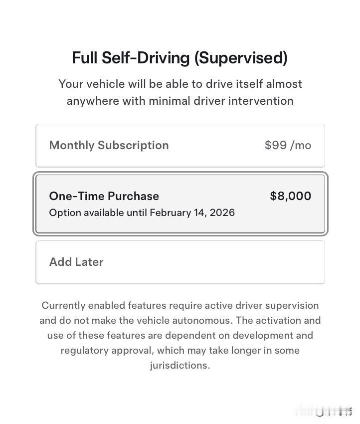 特斯拉新闻:特斯拉已正式在美国和加拿大停止提供自动驾驶功能。所有新车均标配交通感知巡航控制系统。 在线配置器现已更新,允许买家选择每月 99 美元的 FSD 订阅服务,同时在 2 月 14 日之前仍提供以 8,000 美元的价格直接购买 FSD 的选项。 购买特斯拉新车仍可享受 30 天 FSD(监督驾驶)免费试用。
