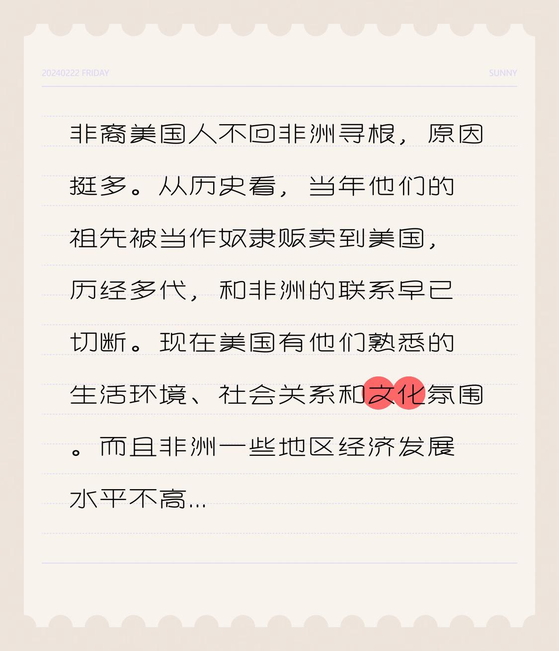非裔美国人不回非洲寻根,原因挺多。从历史看,当年他们的祖先被当作奴隶贩卖到美国,历经多代,和非洲的联系早已切断。现在美国有他们熟悉的生活环境、社会关系和文化氛围。 而且非洲一些地区经济发展水平不高,生活条件和美国比起来差距较大。比如美国的基础设施、医疗教育等都相对完善。另外,非裔美国人在美国已经形成了独特的文化,像嘻哈文化等,他们对自己“美国身份”的认同感很强,所以即便知道根源在非洲,也不一定会回去寻根。