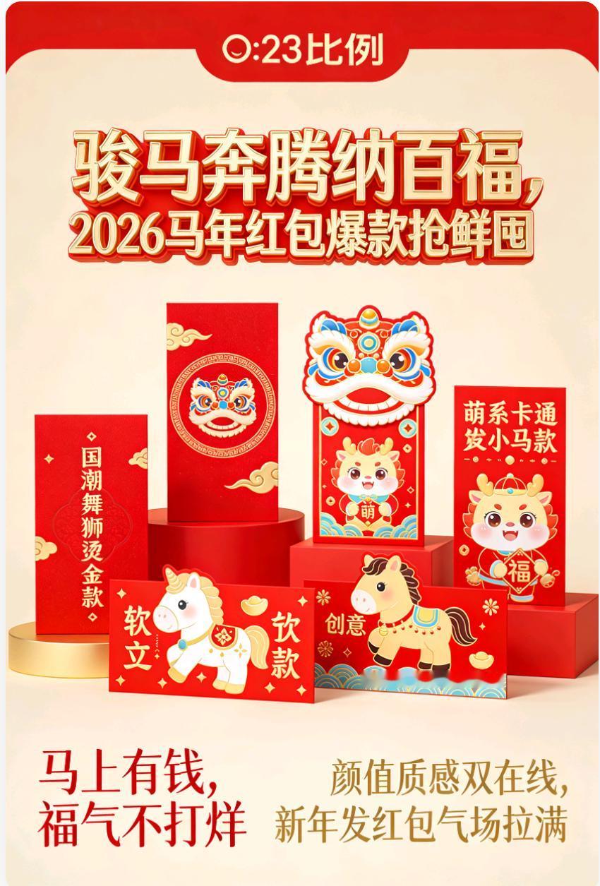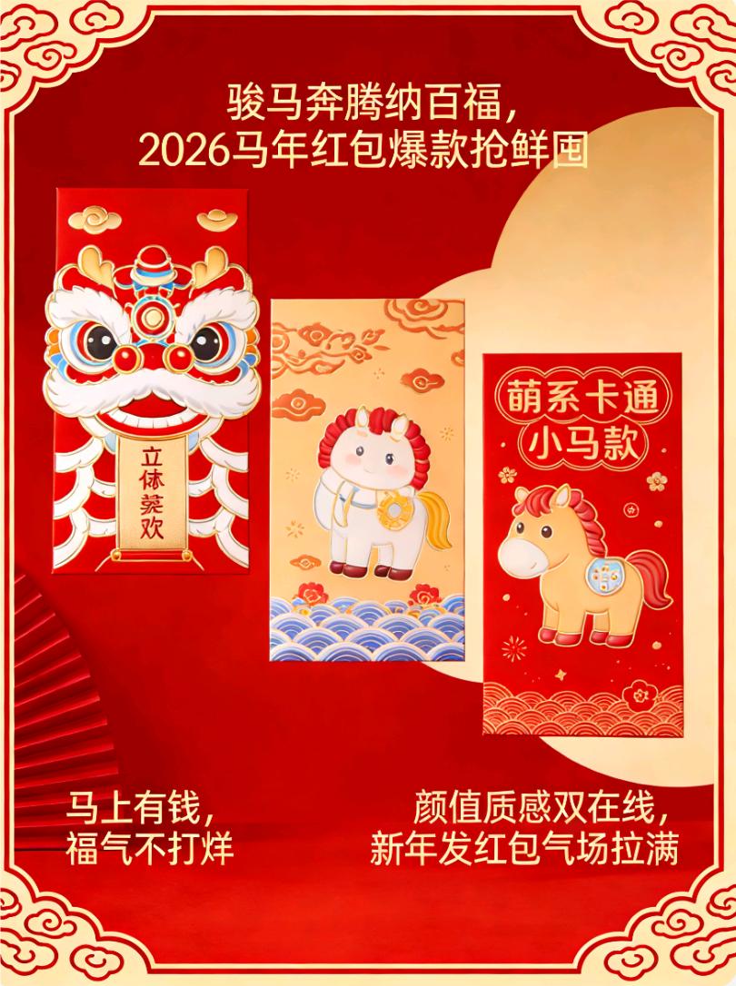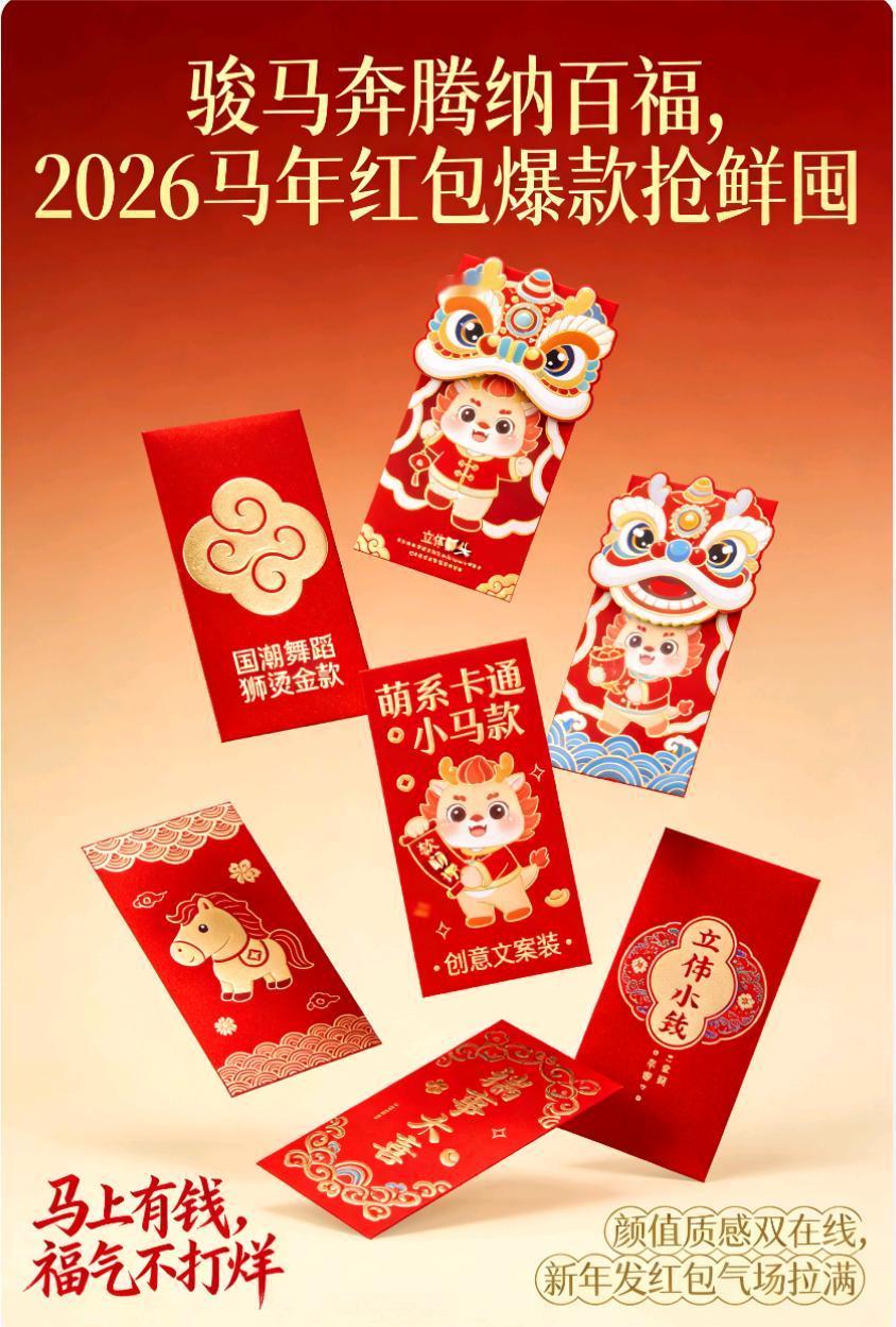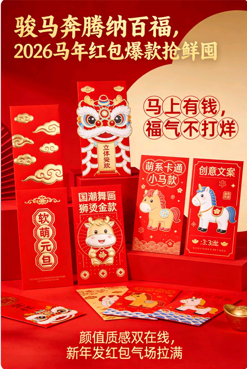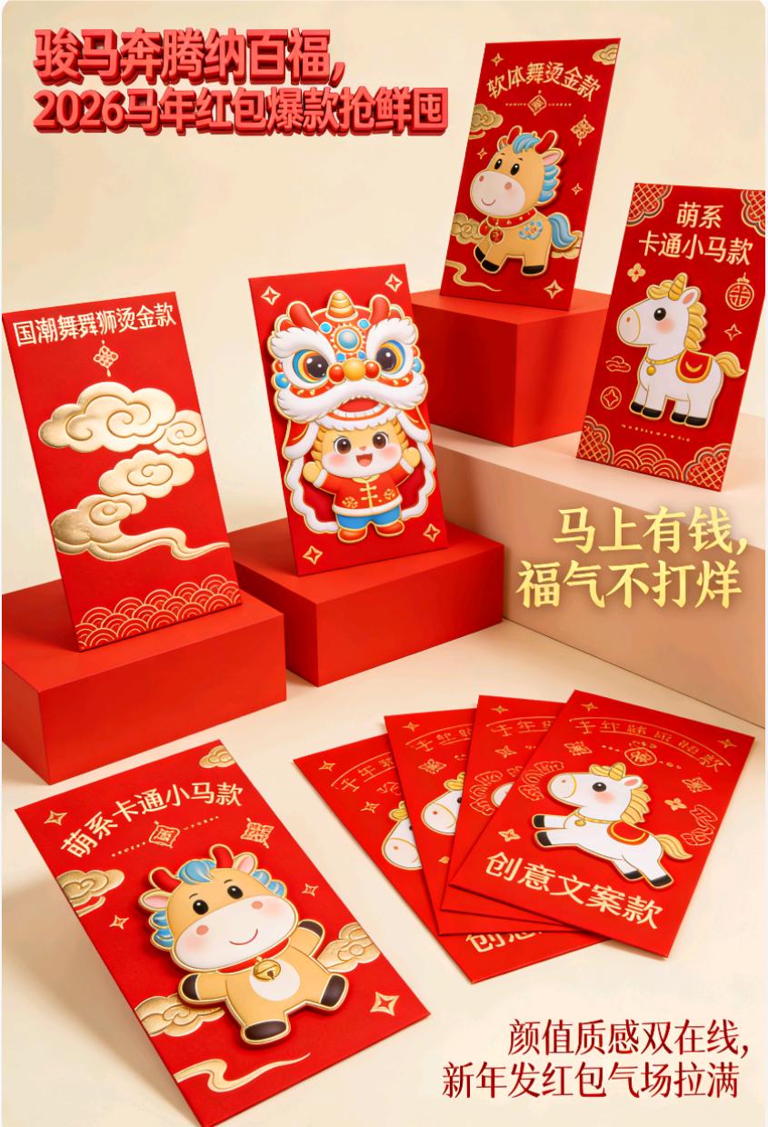 2026马年红包卖爆预警❗ 年味仪式感全靠它撑场🥳 今年马年红包直接卷出新高度,爆款款式闭眼入不踩雷~ 国潮风舞狮小马款最抢手,烫金祥云+立体狮头,红底金纹显贵气,给长辈发超有面儿😎 萌系卡通小马款自带童趣,粉蓝撞色+软萌图案,小朋友收到直接开心到跳脚~😆 年轻人超爱的创意款也超火,“马上有钱”“烦恼马上下线”等潮流文案,发闺蜜兄弟氛围感拉满,拆红包都多了份快乐✅ 加厚耐磨卡纸+精致锁边,装钱不软塌,颜值质感双在线,压岁、拜年、乔迁、婚宴全适配👍 马年寓意更是顶流:骏马奔腾纳百福,万事顺遂马到成🎊 现在囤货正当时,早买早省心,避免过年断货涨价,让你新年发红包脱颖而出,福气财运一把拿捏~🐴💴🎉 马年红包封面 马年卡通红包 马年本命年红包 马年创意红包袋 马年红包创意