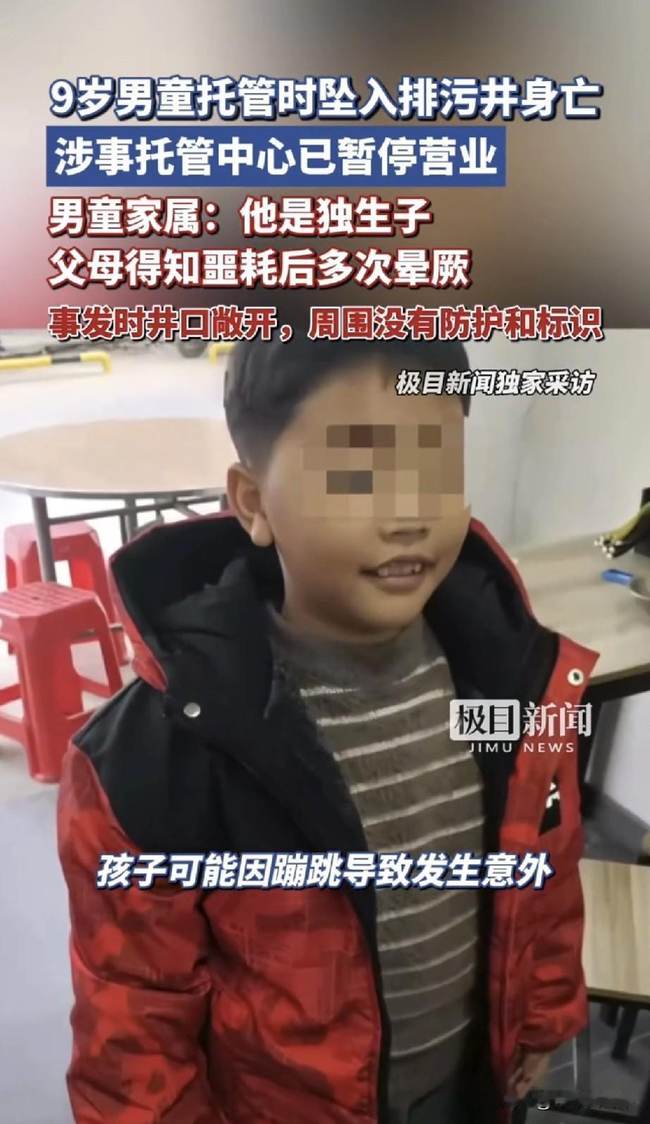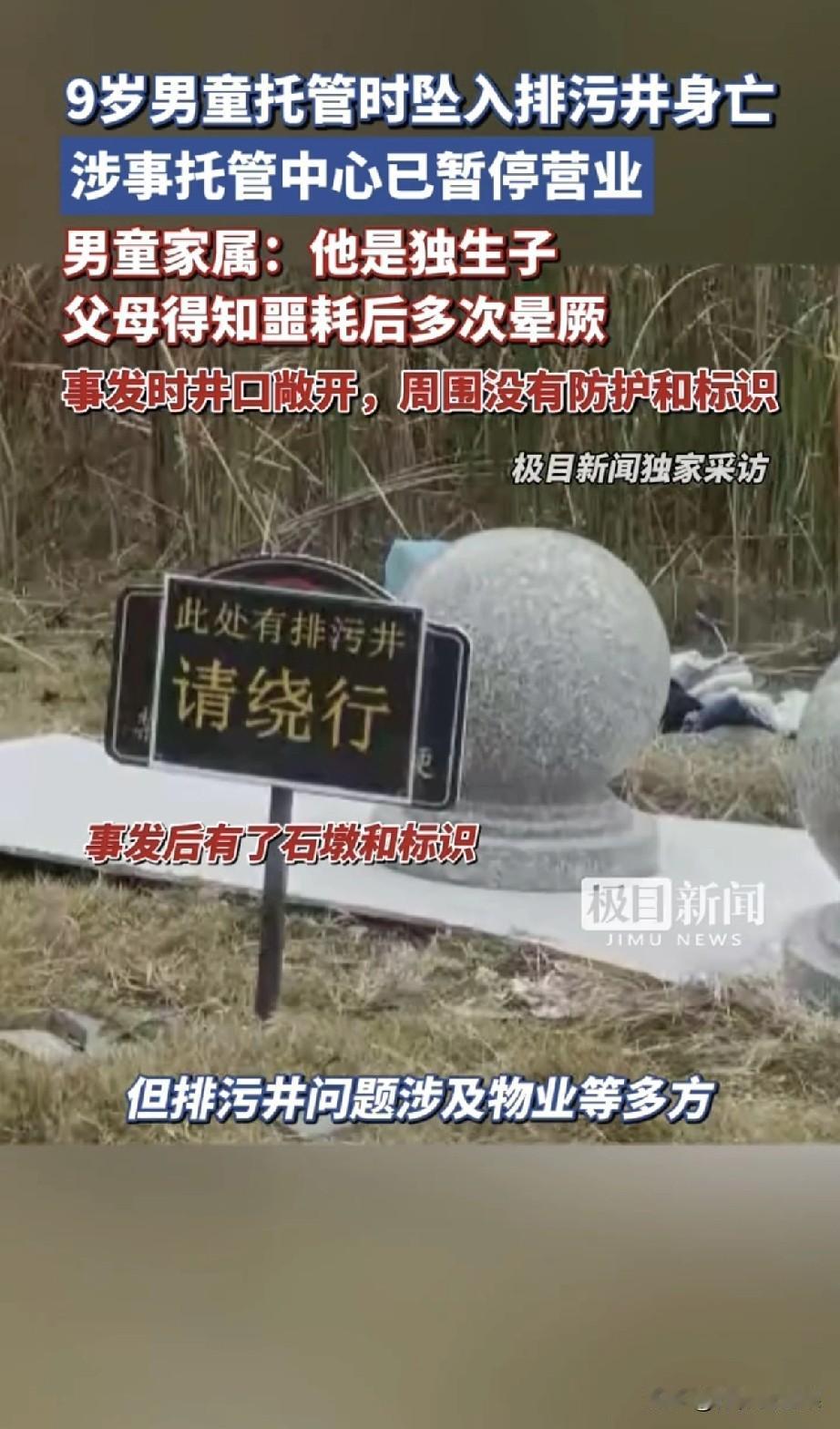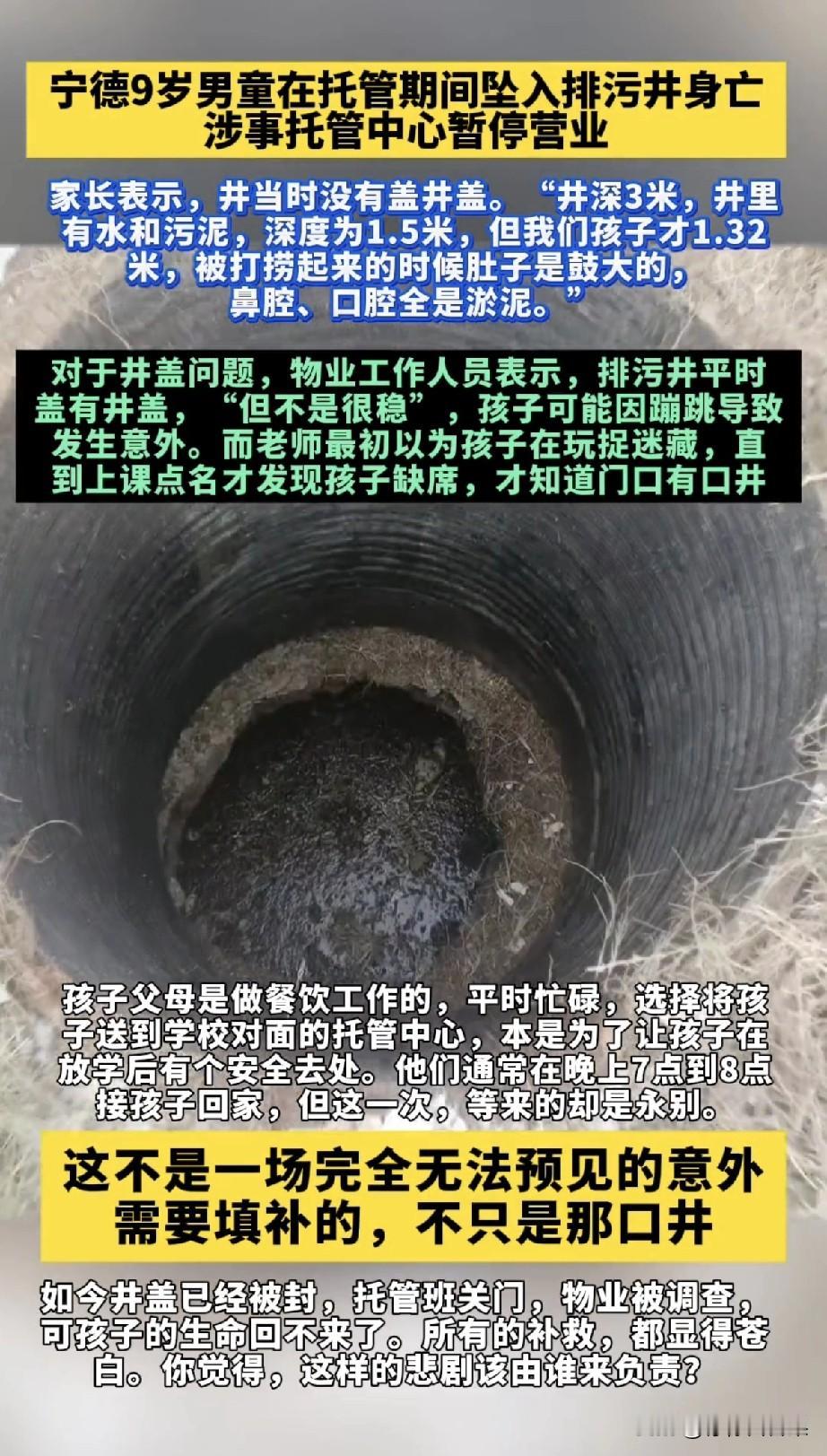 3米深的排污井,一口吞掉了9岁男孩的命!福建宁德那个9岁的小男孩,本在托管班门口的草坪上奔跑玩耍,如今却变成了一具冰冷的身体。 他是家里的独苗,爸妈开了个小餐馆,每天起早贪黑在油烟里打转,把他送到托管班,就是怕他一个人放学不安全。 “我只是想让他有个安全的地方!” 妈妈抱着孩子的身体,哭得浑身发抖,眼泪混着鼻涕糊了满脸,好几次直接晕厥过去。 爸爸跪在井口边,一下一下捶着地面,指甲缝里全是泥:“我早上还摸了他的头,说晚上带他去吃汉堡……” 更让人心碎的是,那口井的井盖根本就没盖!周围连个警示牌都没有!托管老师直到上课点名才发现孩子不见了,还以为孩子在玩捉迷藏。物业事后却说:“井盖平时盖着,但不稳。”而托管班才想起“我们没注意到那口井”。 不稳?!不稳你为什么不修好?!不稳你为什么不拦起来?! 老师轻飘飘的一句“没注意”,物业的一句不稳,怎么对得起那个失去生命的小男孩。 出事后,井口终于立起了“请绕行”的牌子,石墩也挡上了。可那个会扑到爸妈怀里撒娇的小男孩,那个会在草坪上蹦蹦跳跳的小男孩,再也回不来了! 我们总在出事之后才想起“安全”,却忘了每个孩子的童年,都经不起一次“万一”。