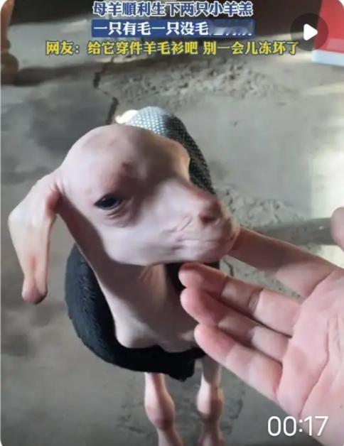 新疆一只母羊产下双胞胎,竟出现一只有毛、一只无毛,主人:担心小羊着凉,给它穿上了衣服保暖 阿勒泰的零下三十度里,崔女士家的羊圈迎来了件新鲜事:母羊顺利产下双胞胎,可姐弟俩的模样却差了十万八千里——姐姐毛茸茸、圆滚滚,典型的可爱小羊羔模样;弟弟却浑身光溜溜,连一丝绒毛都没有,粉红的皮肤直接暴露在寒风里。养了十几年羊的崔女士吓了一跳,活这么大从没见过这阵仗,网友们更是调侃:“这怕不是‘假双胞胎’,怕不是抱错了吧?” 但玩笑归玩笑,崔女士第一时间把两只小羊抱进了暖房。看着无毛小羊冻得瑟瑟发抖,她连夜赶制了件小衣服,小心翼翼地给它穿上,还特意调整了领口袖口,既保暖又不影响它吃奶、跑动 。视频里,穿衣服的小羊羔蹦蹦跳跳,跟着有毛的姐姐身后跑,圆滚滚的身子裹着专属“冬装”,模样又萌又治愈。网友们瞬间被圈粉:“这衣服也太合身了!主人也太细心了”“隔着屏幕都觉得暖,万物有灵且美”。 有人好奇这罕见现象的原因,专家推测大概率是基因突变,就像动物界偶尔出现的“无毛个体”,在绵羊身上尤为少见。也有网友联想到新疆的畜牧品种改良,近年来当地通过杂交、基因技术提升羊的繁殖力,双羔率大幅提高,但这样“一毛一无毛”的双胞胎,仍是万中无一的奇迹 。更有意思的是,世界上确实存在天生无毛的“ hair sheep ”品种,耐暑抗病,但多生长在热带地区,出现在寒冷的阿勒泰,更添了几分神秘色彩。 但比起自然奇迹,更打动人的是崔女士的温柔。她没有因为小羊“特殊”就忽视它,反而加倍呵护,给它穿衣服、调温房、勤观察,这份对生命的尊重,藏着最朴素的善良。在新疆的牧场里,这样的故事其实每天都在上演:牧民们给早产的羊羔喂羊奶,给受伤的牛羊治伤,把动物当成家人般照料。就像有网友说的:“不是人类驯化了动物,而是彼此陪伴,温暖了岁月。” 这只无毛小羊的走红,或许正是因为它戳中了我们内心最柔软的地方。在快节奏的生活里,我们见多了功利与浮躁,却依然会被这样纯粹的美好打动——自然的奇妙、生命的顽强、人间的善意。零下三十度的严寒里,小羊的衣服是保暖的屏障,而主人的爱心,是比任何衣物都更温暖的光。 此刻只想说:愿这只“特殊”的小羊能健康长大,也愿每个生命都能被世界温柔以待。你被这只穿衣服的小羊萌到了吗?你还见过哪些动物界的暖心瞬间?欢迎在评论区分享~毛绒绒的小羊 新疆大屁股羊