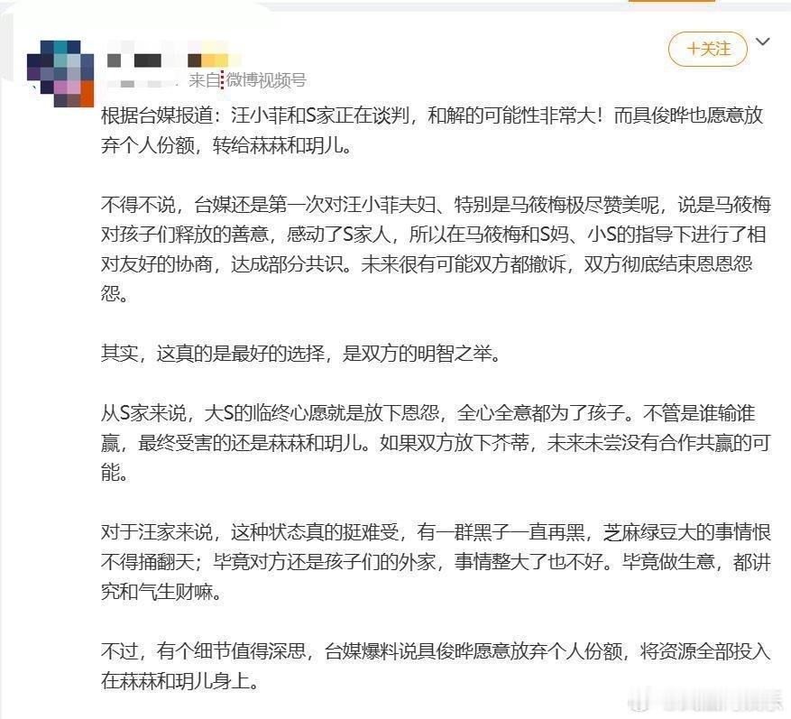 汪小菲和S家或将握手言和 近期,台媒爆料汪小菲和S家正在谈判,和解的可能性非常大。具俊晔也愿意放弃个人份额,转给菻菻和玥儿。台媒还表示,汪小菲现任妻子马筱梅对大S的一双儿女释放善意感动了S家人,两家人才有了和解的可能性。