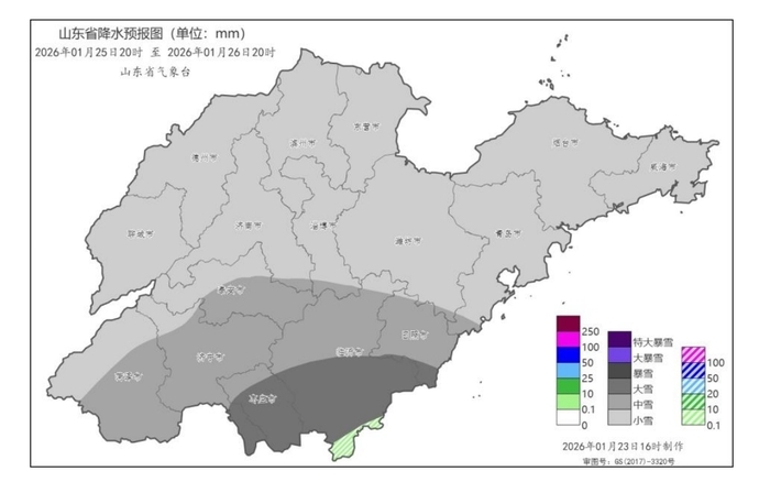 山东省气象局1月23日16时发布重要天气报告:受冷空气和暖湿气流共同影响,预计25日夜间到26日白天,我省自西向东将有一次较明显雨雪天气过程,全省累积平均降水量1~3毫米。