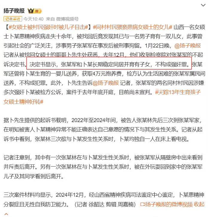 精神失常女硕士失踪13年,被人带回家生了两个孩子,另遭同村2人强奸7次,最后被哥哥找到…“决定书显示,张某军和卜某长期稳定同居并育有子女,不构成强奸罪。张某军还曾将卜某生育的一婴儿送养,获取4万元抱养费,检方认为生活困难的张某军属民间送养,不构成犯罪。张某军的两名同村村民因涉嫌多次强奸卜某被检方公诉”……不想说相关判决,我想问问,13年前。已经2012年了,为什么农村还会发生这样事?个别地方的基层,多少有些失灵。女生遭强奸 未遂强奸 婚内强奸