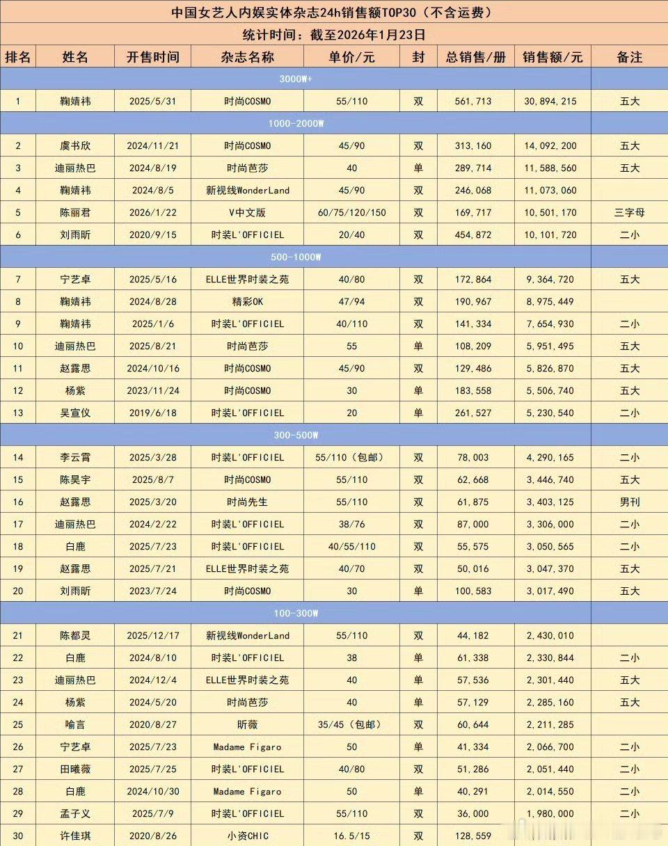 内娱男/女艺人实体杂志24销量销售额拉表