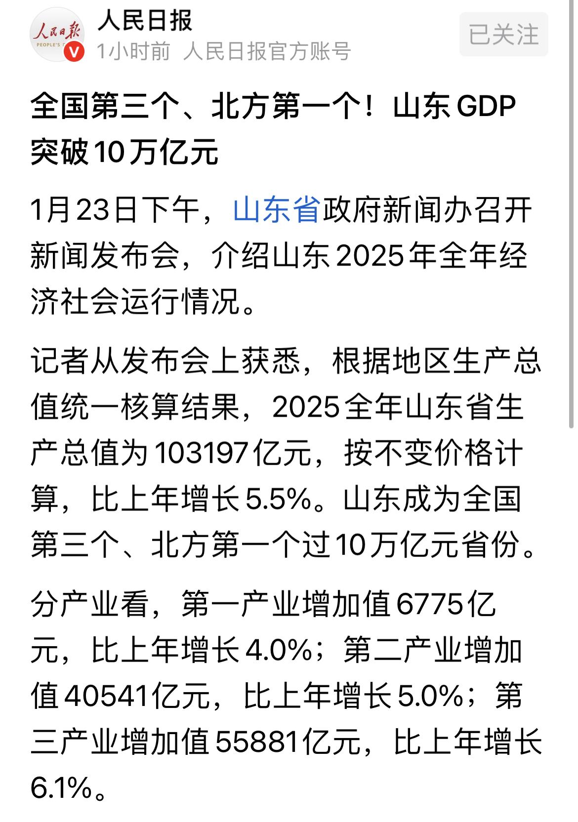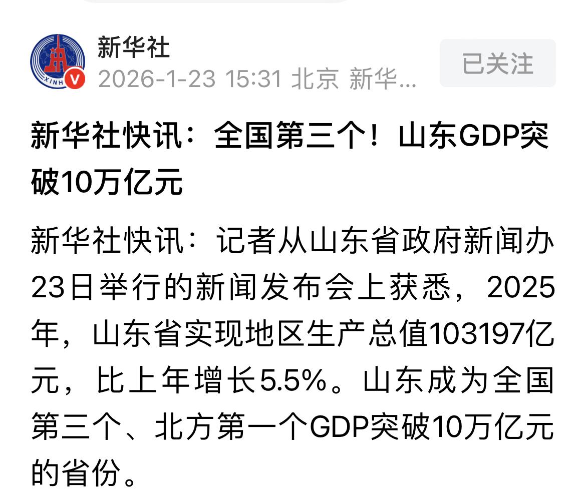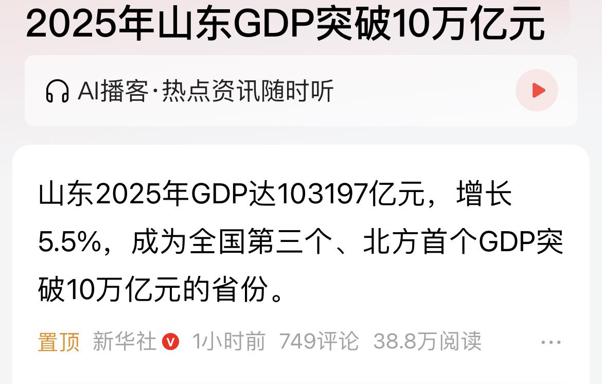 人民日报跟新华社齐下场报道山东破十万亿GDP[笑哭]大山东何德何能竟送两大媒体。再过两年浙江也该破十万亿了。但是再过两年广东老大位置可能不保[笑哭]江苏太猛了。