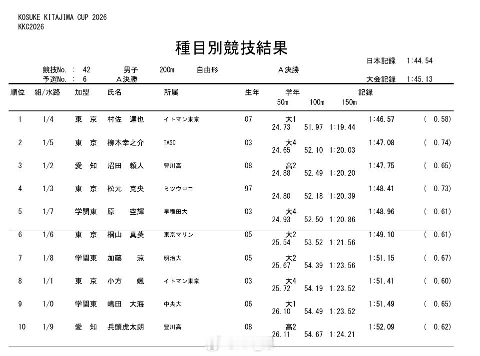 北岛康介杯 男200自决赛村佐达也 1:46.57柳本幸之介 1:47.08松元克央 1:48.41第四