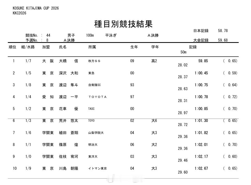 北岛康介杯 男100蛙决赛大桥信 59.85