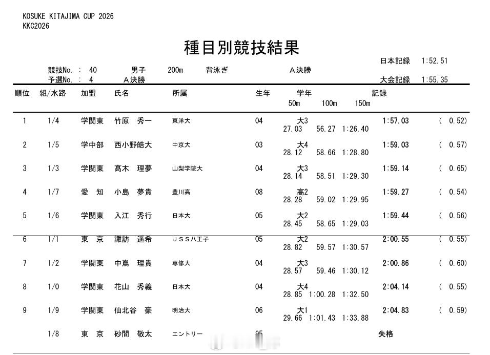 北岛康介杯男200仰决赛竹原秀一1:57.03