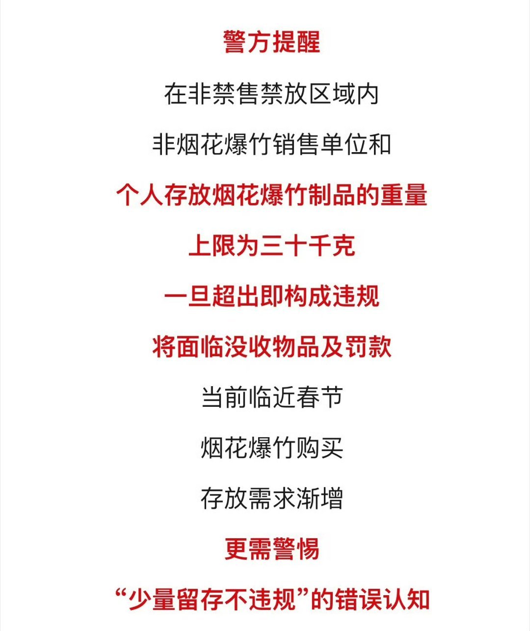 宁波人注意家里放烟花超过30公斤就要被罚 ,快过年了,大家都注意!个人存放烟花爆竹制品的重量上限为三十千克!一旦超出即构成违规将面临没收物品及罚款!家里仅存放2件就被罚!宁波人注意了临近春节,烟花爆竹购买存放需求渐增但安全底线绝不能碰!1 月 12 日,杭州一派出所查处一起非法储存危险物质案。村民王某某(化名)因在家中存放 2 件组合烟花,实际重量均超出规定标准,被依法罚款并没收违规物品!来源:宁聚