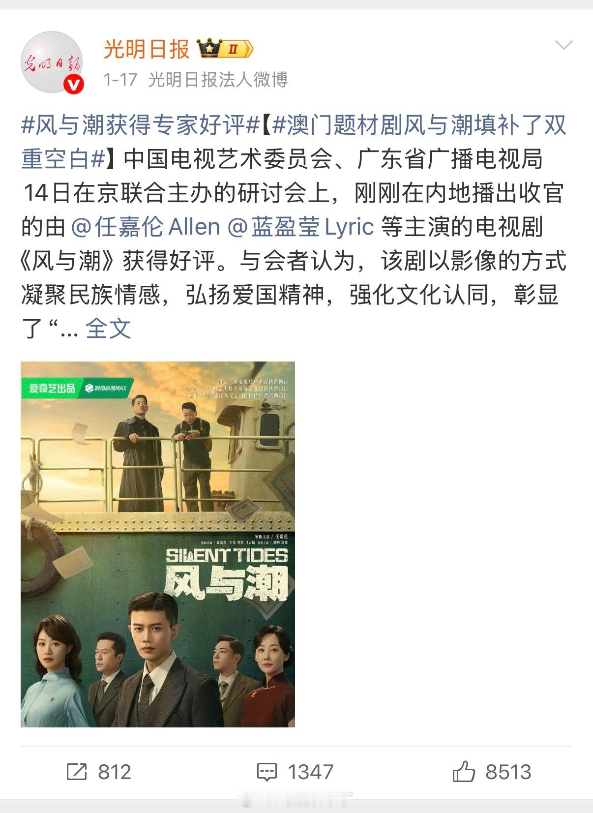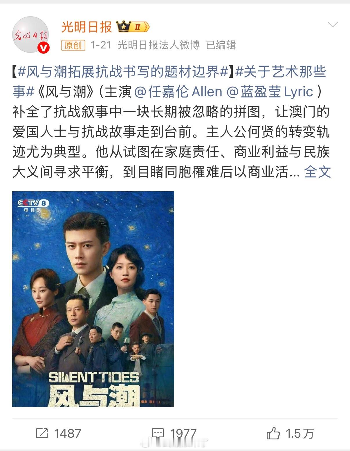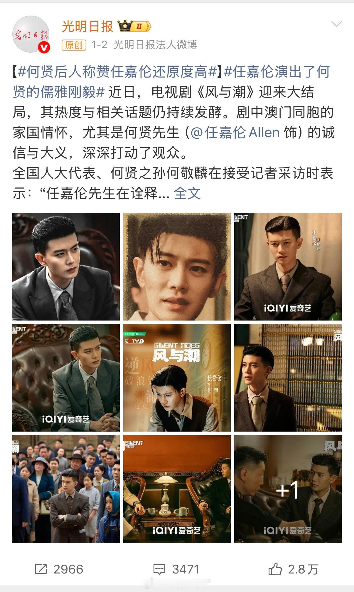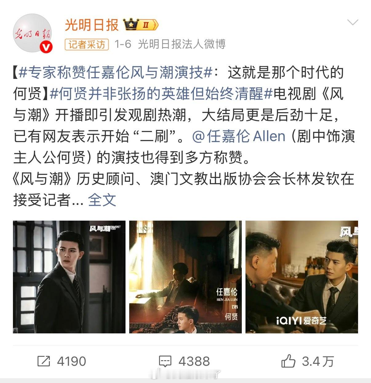 光明日报1月发了5次风与潮 《光明日报》光今年1月份就五次发文夸任嘉伦主演的《风与潮》。这部剧尊重史实,艺术创作水平很高,填补了澳门抗战历史空白,任嘉伦用精湛细腻的演技成功塑造何贤先生一角,真实动人,表现十分出色,确实可以说是历史正剧标杆👍风与潮成开年主流口碑标杆