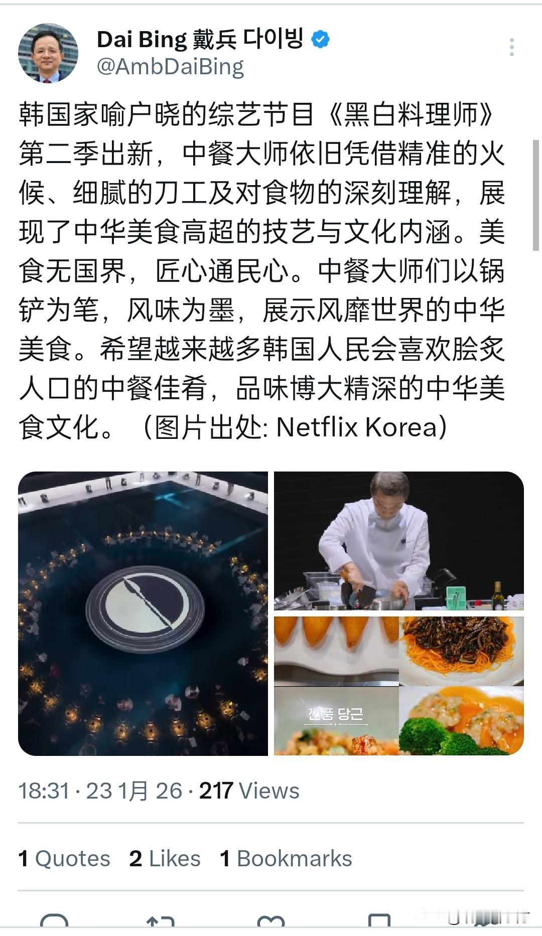戴兵大使用中文和韩文推广中餐。