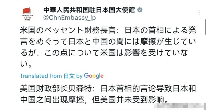 日本国内破防了!1月23日,中国驻日大使馆转发了美国财长贝森特的话。中国驻日大使馆刊文称,美财长贝森特表示:日本和中国,因为日本首相的一些言论而发生了摩擦,不过,美国在这方面并未受到影响。很显然,日本网友看见这样的刊文之后,显得非常的破防。 要知道,日本首相发表的那些言论,就是在中美之间瞎搅和。这就好像是一个人在两个厉害的邻居之间乱说话,自己还以为能占到便宜。而日本这么做,很大程度上是想抱紧美国的大腿。你想想看,美国在国际上那可是有很大影响力的,日本就觉得傍上美国,自己在国际上说话就能更有分量。可这算盘打得太精了,往往就容易出问题。 要清楚,日本这种跟着强国跑的事儿也不是头一回了。当年二战的时候,日本就跟着德国到处惹事儿,最后还不是被打得惨兮兮。现在又想在中美之间玩火,这不是重蹈覆辙吗?这就跟下棋似的,日本这一步棋看似走得巧妙,实际上却是一步险棋。 说实话,日本这么做可能是自认为跟着美国能得到一些好处,比如说在军事上得到更多的支持,在经济上能有更多的合作机会。可实际上,它这么做,得罪了中国。而中国是日本重要的贸易伙伴,这就好比是捆在一起的螃蟹,一荣俱荣,一损俱损。日本这么一闹,在经贸方面肯定会受到影响。很多日本的企业,像汽车、电子产品这些,在中国都有很大的市场。要是因为日本首相的言论,导致两国关系紧张,这些企业的日子肯定不好过。 而这对美国来说,它就是想利用日本来牵制中国。美国就像一个精明的棋手,把日本当成了自己的棋子,在棋盘上随意摆弄。美国才不会真正关心日本的死活呢,只要日本能为它所用,能帮它达到遏制中国的目的,它就会给日本一点甜头。可一旦日本没有利用价值了,美国肯定会毫不犹豫地把它抛弃。 与此同时,这事儿对普通人也有间接影响,比如说,日本国内的物价可能会因为贸易问题而上涨。很多日本民众喜欢吃的进口食品,可能因为关税或者贸易限制,价格变得更高了。而且,旅游业也会受到冲击。以前很多中国游客喜欢去日本旅游,给日本带来了不少的收入。现在两国关系紧张了,去日本旅游的中国游客可能就会减少,这对日本的旅游从业者来说,可不是什么好消息。 而未来可能会发生几种情况:一是日本要是能及时醒悟,认识到自己的错误,调整外交政策,缓和与中国的关系,那么两国的经贸往来可能会逐渐恢复正常,日本的经济也能避免进一步的损失。二是日本要是继续执迷不悟,跟着美国一条道走到黑,那么中日关系可能会越来越僵,日本在经济、外交等方面都会陷入更加被动的局面,甚至可能会引发国内的社会矛盾。 说到底,日本在国际事务中应该有自己的独立思考,不能一味地跟着美国跑。在中美之间保持平衡,与中国友好合作,才是对日本最有利的选择。日本要是继续在中美之间搅局,最后受伤的只能是自己。 以上是小编个人看法,如果您也认同,麻烦点赞支持!有更好的见解也欢迎在评论区留言,方便大家一同探讨。
