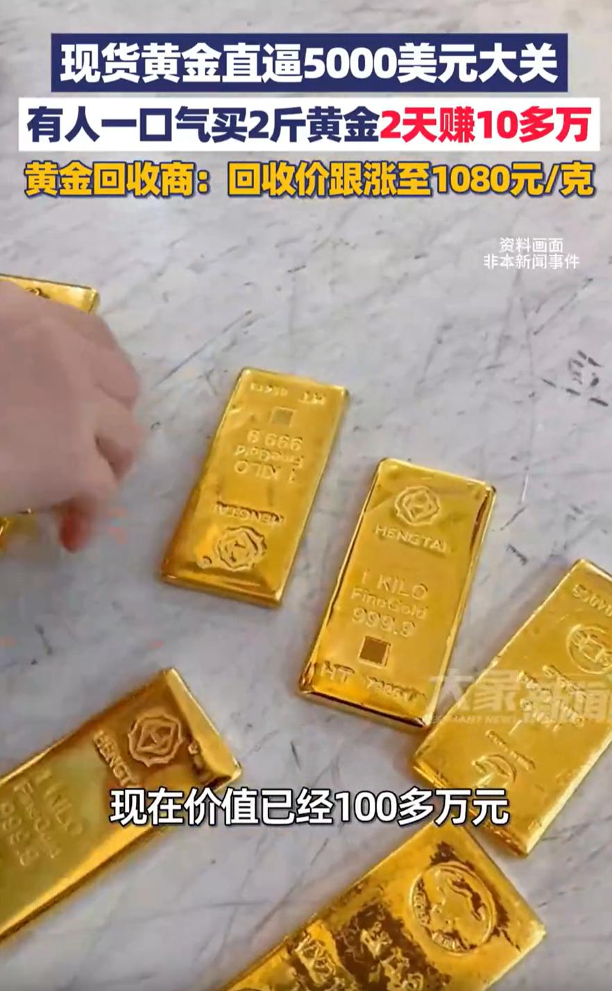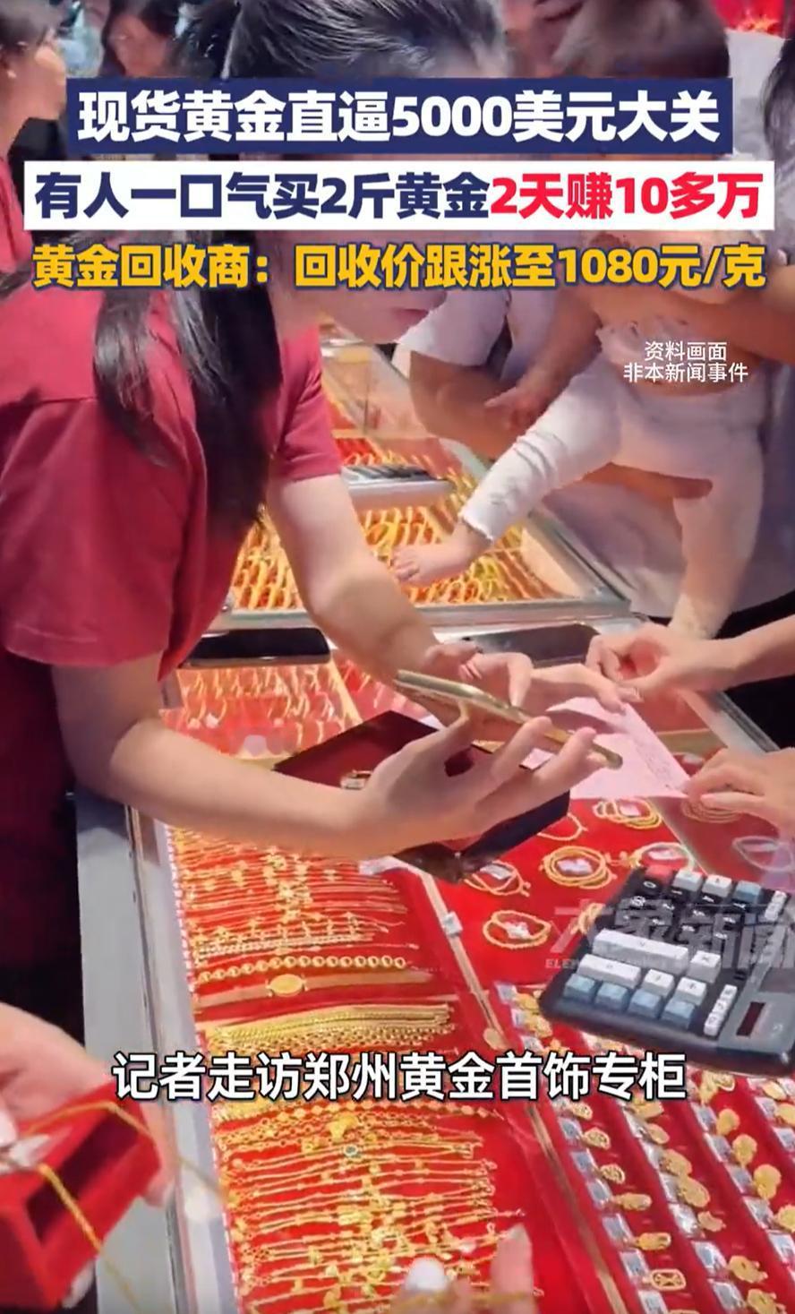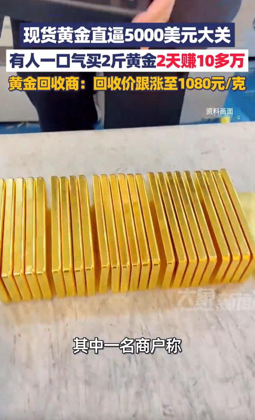 这就是命啊!河南郑州,一男子见近期金价有上涨趋势,就一口气买了2斤的黄金,没成想,仅仅过去两天,男子就赚了10多万,而卖给顾客黄金的商户,看着也是眼馋不已。网友:卖早了! 这个大叔的操作,说起来其实很简单,抓住了市场的风口。买入时的价格虽然已经不算便宜,但他看金价那阵子蹭蹭往上走,心一横,直接掏了九十多万,买了一公斤黄金,沉甸甸的两斤,拎在手里,分量不轻 谁能想到,他这一出手,刚好踩在节骨眼上。买完才两天,国际金价还在往上冲。他手里那两斤黄金,市值眼看着就跳上了一百万。算一算,两天时间,账面上多了十多万利润。这速度,可比干什么都快 不过,卖给他黄金的商户,心里可就没那么高兴了。说来有些无奈,眼看着金价上涨,商户也只能在心里默默想,“要是卖的晚一点,自己也能赚得更多。”但市场就是这么不确定,你永远不能预见下一步会怎样 其实这种故事,每隔一段时间就会冒出来。每次金价剧烈波动,总会有人押对宝,瞬间暴赚;也肯定有人看走眼,高位套牢。它像一场静默又刺激的赌博,考验的是眼光、胆量,还有那么一点运气 男子看似轻松赚了十万,背后是他对趋势的一次大胆判断。这钱赚得并不虚,它需要真金白银的投入,也需要承受可能下跌的风险 相比之下,更多普通人的理财方式,是细水长流,是每月定投一点,是买个小金豆攒着,图个安心。这两种方式没有高下之分,只是选择不同