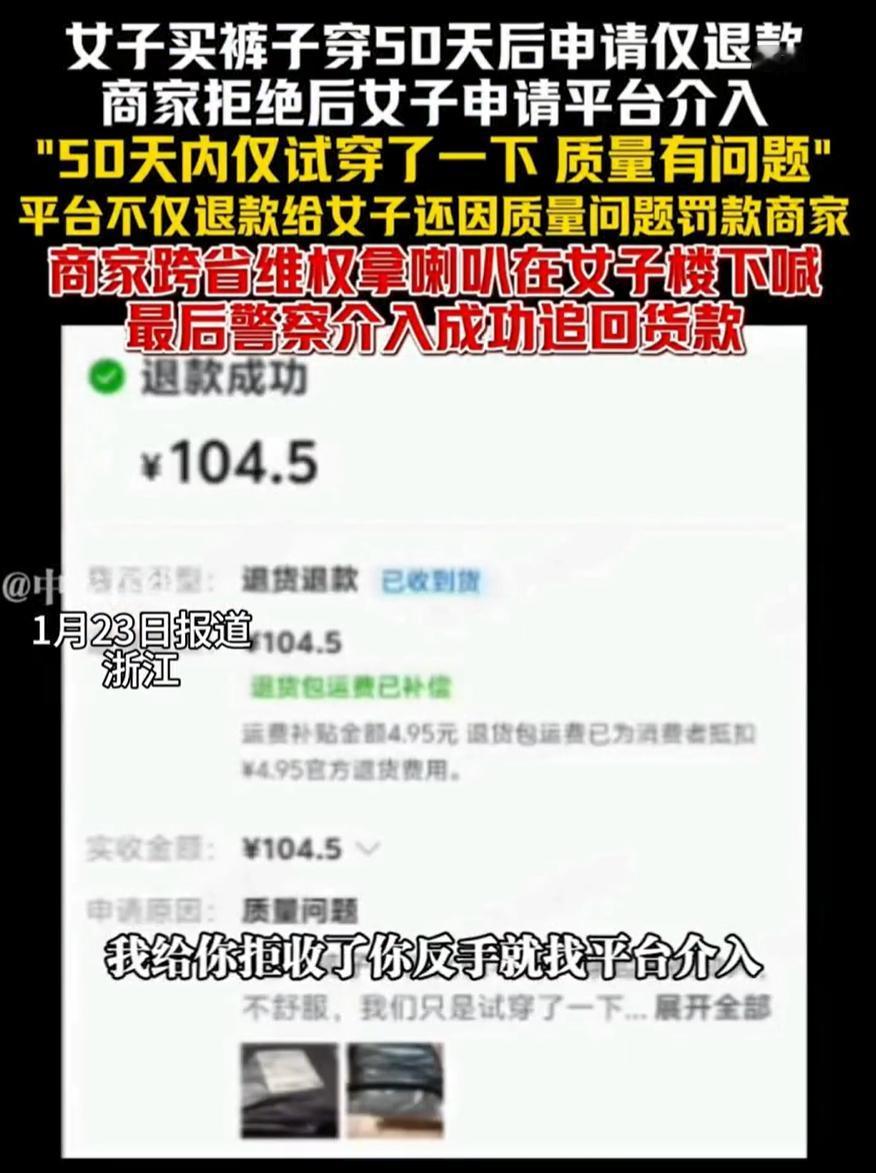 这次踢到铁板了!上海,一女子网购了一件裤子,结果穿了50多天,突然在平台申请仅退款,商家拒绝后,女子又找平台介入,结果就是钱也拿回来了,裤子也留下了,商家还被罚了款,商家越想越气,直接拿着喇叭跨省来到对方的楼下喊,这一下便宜没占到,还让邻里乡亲都知道了 商家介绍,自己湖州开网店,本来生意就不算好,平时还要兼职跑外卖,一天也就賺了150元,结果这名唐女士,下单了一条104元的裤子,签收超过50天,突然以质量问题为由进行仅退款,她自然是接收不了的,当场就点了拒绝 可唐女士这边没罢休,她又找到平台投诉,平台介入后,直接把货款退回给她,然后还罚了商家6块钱,理由就是质量问题,自己一分钱没赚到不说,孩搭了裤子,罚款和运费,商家实在咽不下这口气 于是她拿着喇叭,顺着对方的收货地址找了过来,直接在楼下喊,还在网上曝光了。最后在警方的介入下,把钱退还给商家了 整件事听起来有点像闹剧,但背后藏着不少网店小卖家的真实困境。如今开网店成本不低,竞争又激烈,很多店主都是咬牙撑着,有的还兼职跑外卖补贴开销。像这位商家,一天辛苦下来也就赚一百来块,一条裤子的单子,对她来说不算小事 可问题出在哪?平台的处理机制常常让人无奈。介入时如果只凭买家一面之词,或者简单判个“质量问题”就扣款退款,对小商家来说,有时就是一笔冤枉账 而且五十多天还能发起仅退款,这个规则本身是不是也该有个合理期限? 这件事最后虽然退了钱,但商家付出的时间、路费、精力,其实远远超过一百块。更重要的是,她选择拿喇叭去楼下喊,不是真想闹事,而是实在没别的办法