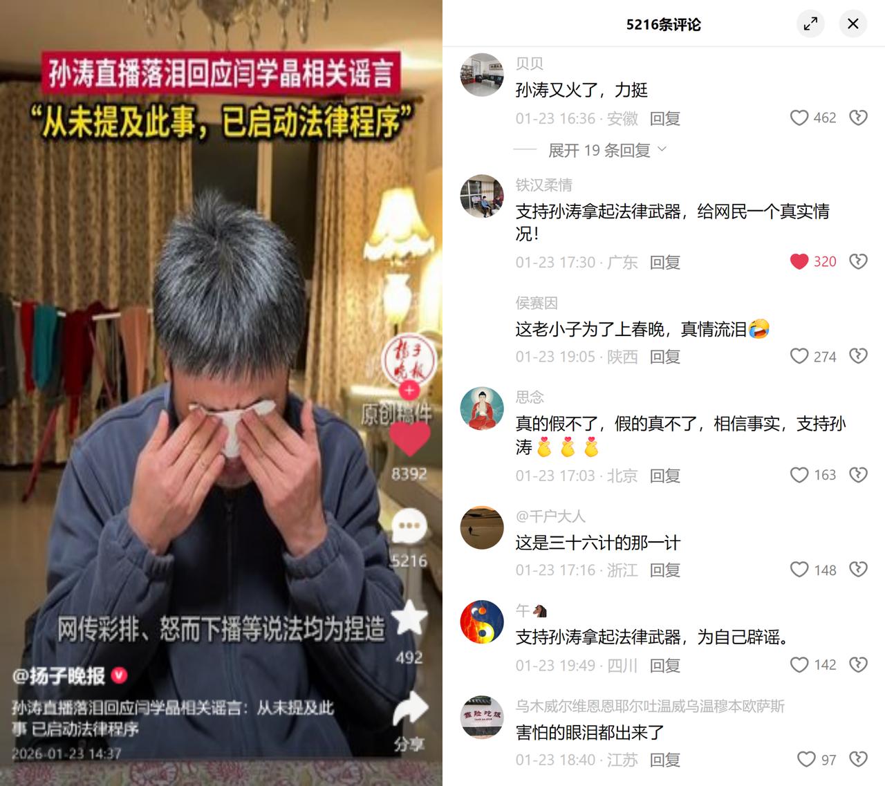春晚常客孙涛直播落泪了,根本没想上春晚,纯粹是被谣言逼得没法儿了。 最近有营销号说他力挺闫学晶、直播带货,甚至编出谁提闫学晶就急的戏码,配的都是旧图旧照,连个完整的直播切片都拿不出来。孙涛急了,直接甩出1月2日的完整直播回放,全程没提闫学晶一个字,也从没挂过小黄车。他说:“要是真有那事儿,上万人看直播,不可能没一个人录屏。” 这事儿细琢磨特典型,现在造谣言都不用编完整故事了,找张旧合作图,配段义愤填膺的解说,再加点知情者爆料,就能凑出个瓜。营销号哪里在乎真相,只想要情绪共鸣:要么骂明星抱团护短,要么骂装委屈博同情,只要流量来了,谁管是不是瞎编? 你看网上那些传得沸沸扬扬的瓜,十有八九是这么来的。大家刷手机的时候,很少有人会去翻几十分钟的完整视频,更不会查有没有实锤,碎片信息看个热闹,情绪上来就骂两句,刚好中了营销号的圈套。 孙涛提到妻子被谣言攻击时,声音都哑了:“她是特别好的妻子和妈妈,不能受这委屈。”比起眼泪,更让人难受的是普通人面对谣言的无力:你没做过的事,得花十倍力气去证明;而造谣言的人,敲敲键盘就赚得盆满钵满。 下次刷到明星爆料、熟人瓜,不妨先问自己一句:“有完整实锤吗?还是就几张旧图?”毕竟,谣言能传得快,全靠我们懒得追根究底的习惯,别让自己变成谣言的帮凶,比骂营销号管用多了。