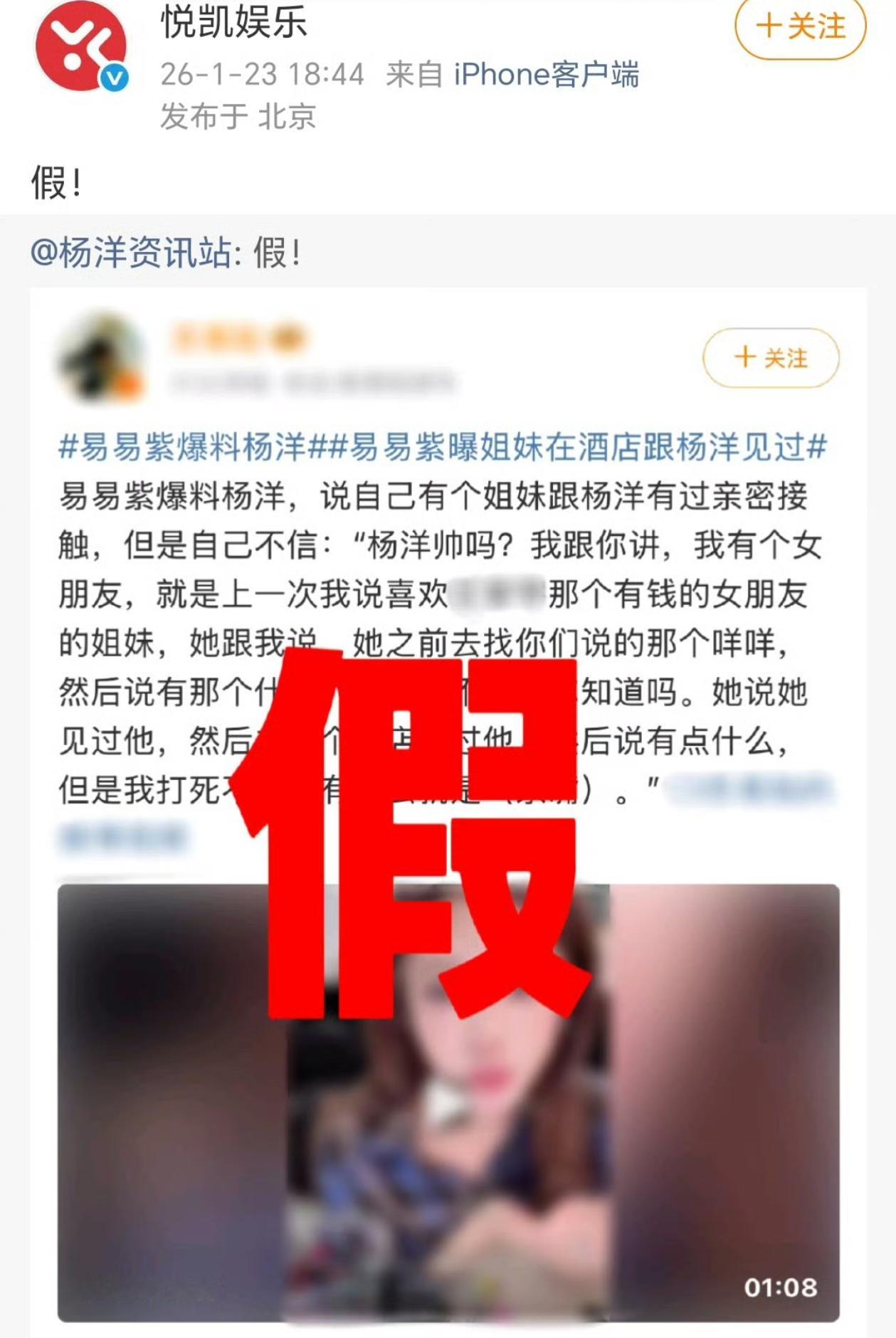 杨洋工作室和悦凯娱乐都辟谣了,假!! 易易紫爆料杨洋
