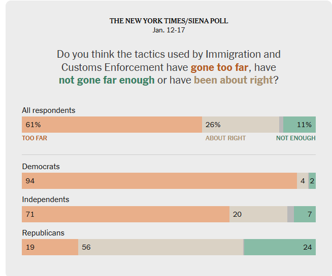 民调显示,美国选民对驱逐移民问题意见分歧,但普遍厌恶ICE的作法海外新鲜事 根据《纽约时报》与锡耶纳大学联合进行的一项民调,大约一半选民支持特朗普的移民驱逐政策以及他在美墨边境问题上的应对方式,但多数选民认为移民与海关执法局(ICE)做得过火。50%的选民表示,他们支持特朗普政府对非法居留在美人士的驱逐政策,47%表示反对。特朗普在南部边境问题上的应对方式,也获得了50%的选民好评。但在过去一年中,特朗普派出大量ICE执法人员在多个主要由民主党控制的城市展开突袭,引发广泛抗议和街头混乱场面后,多数选民对该机构评价负面。民调显示,仅36%的选民表示认可ICE的执法方式,63%表示不认可,其中独立选民的不满比例高达70%。此外,61%的选民认为ICE在执法策略上“做得太过分”,包括近五分之一的共和党人。这项民调是在37岁的母亲蕾妮·古德被ICE人员在明尼阿波利斯当街枪杀之后进行的。总体来看,当被问及特朗普在移民问题上的处理方式时,58%的选民表示不认可,40%表示认可。为海外华人提供有价值的信息与分析,更多内容和全文可在蓝天、电报、x查找causmoney,或直接谷歌搜索caus.com《纽约时报》/锡耶纳大学的民调显示,支持特朗普处理移民问题方式的选民比例,自他第二任期开始以来略有下降。同时,表示“强烈不满”的比例上升至48%,去年四月这一比例为39%。民调还显示,有超过十分之一的选民在被问及当今美国面临的最重要问题时,提到了移民或移民执法。拉美裔选民比黑人或白人选民,更可能将移民视为美国当前面临的最重要问题。但更多拉美裔表示,他们认为经济问题更为重要。在特朗普处理美墨边境事务方面,拉美裔选民意见几乎均分,但他们对ICE的执法方式压倒性地表示不满,并认为这个机构做得太过分。来自德克萨斯州莱克杰克逊、现年59岁的惩教人员罗赫里奥·萨利纳斯表示,尽管他认为美国需要严格的移民法律来确保移民“走正当路径”,但他对政府的做法却感到犹豫。他说:“这事是有办法可以处理的。可他们现在这样做,太过火了,根本没有必要。”萨利纳斯没有在2024年投票,也未登记加入任何政党。他特别对一些移民执法人员无明确理由地质问人们国籍的视频和报道感到不满。他说:“他们就那样‘嘿,你是从哪来的?’我真的会怕。如果我出门在市区,我就会想:‘天啊,真庆幸ICE没在我们这活动。’”在移民议题上,党派分歧依然严重。总体而言,84%的共和党人支持政府的移民政策,而95%的民主党人和62%的独立选民表示反对。