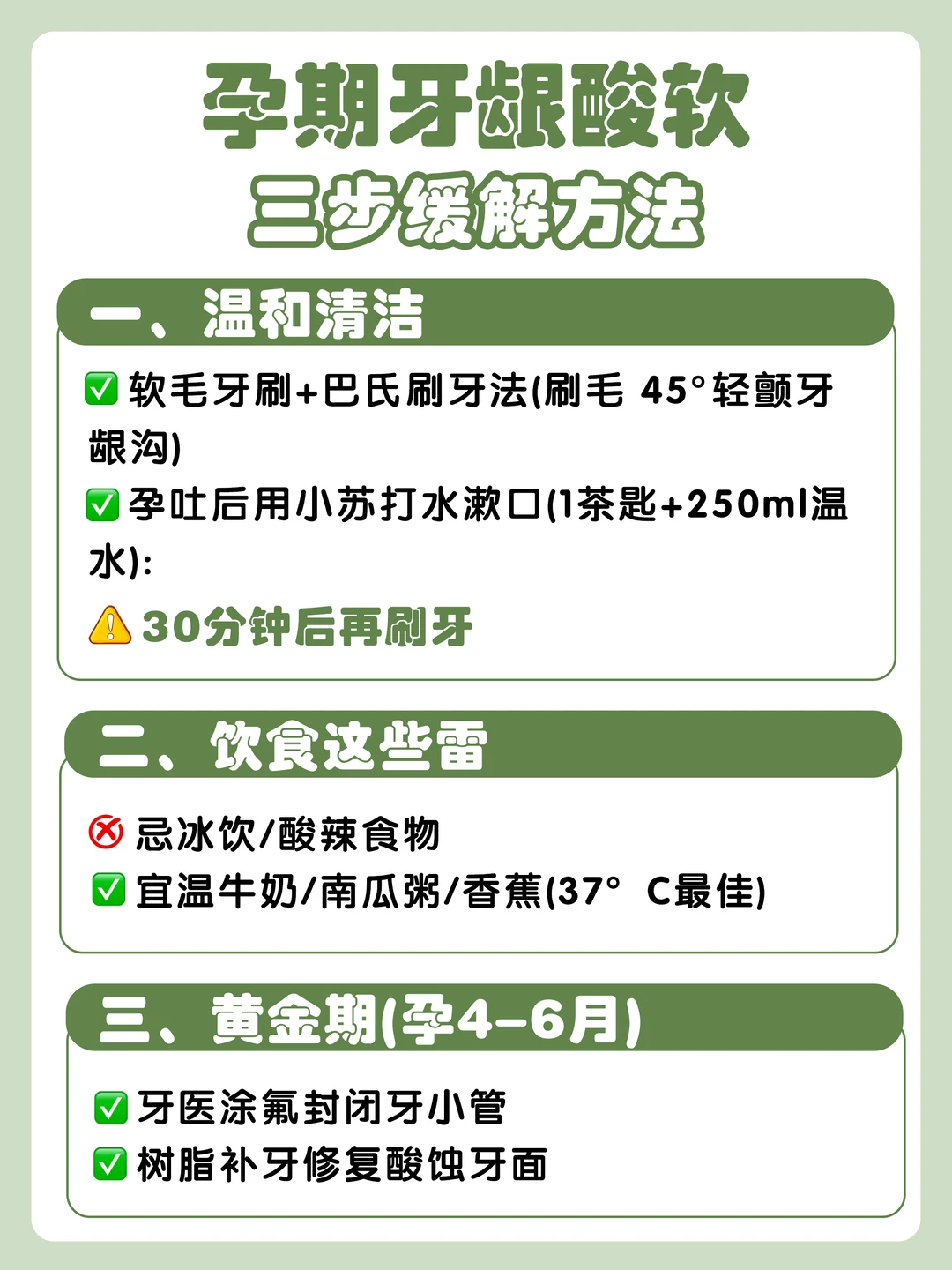 怀孕后牙龈突然“罢工”,刷牙酸、吃东西软,到底是怎么回事?别再盲目用偏方了,这篇科普帮你理清真相,科学修复不踩坑! ✅真相1:牙龈酸软是孕期“生理性预警” 不是你护理不到位,而是身体在提醒你:“口腔需要特殊保护啦!” 孕期雌激素升高会让牙龈进入“敏感模式”,就像皮肤换季敏感期一样,此时只要做好温和护理,就能平稳度过。 ✅真相2:不及时修复,可能影响胎儿 很多孕妈觉得牙龈问题是小事,其实不然!口腔炎症产生的细菌可能通过血液循环影响胎盘,增加早产、低体重儿的风险,同时长期牙龈酸软还会发展为牙周炎,导致牙龈萎缩、牙齿松动。 ✅真相3:孕期口腔护理,选对方法比“贵”更重要 不用买一堆网红产品,抓住核心3点就够: • 清洁要“柔”:软毛牙刷+温和牙膏,搭配牙线清理牙缝残渣(牙线比牙签安全,不会戳伤牙龈); • 饮食要“淡”:减少酸甜、过冷过热食物,避免刺激牙龈和牙釉质,饭后用温水漱口; • 营养要“全”:除了维生素C、K和钙,还要补充蛋白质(鸡蛋、瘦肉、鱼虾),帮牙龈组织修复。 📝分阶段修复方案(直接抄作业) • 孕早期(1-3个月):重点缓解孕吐对口腔的影响,孕吐后用温水+少量小苏打漱口(中和胃酸),避免用力刷牙; • 孕中期(4-6个月):可进行洗牙、口腔检查,搭配孕妇专用牙龈修复凝胶,每晚睡前涂抹酸软部位,促进修复; • 孕晚期(7-9个月):坚持日常护理,避免剧烈口腔治疗,若出现严重疼痛,及时就医对症处理。 🧪科学小知识:为什么孕期不能用普通漱口水? 普通漱口水含酒精、氯己定等成分,酒精会刺激孕吐,氯己定长期使用会导致牙齿染色,还可能影响胎儿发育。孕妈可选“无酒精、含植物提取物(如金银花、薄荷)”的温和漱口水,每周使用2-3次即可。 孕期口腔健康是母婴健康的重要一环,别忽视牙龈酸软的信号,科学护理才能既安心又舒适~ 转给身边需要的孕妈吧!