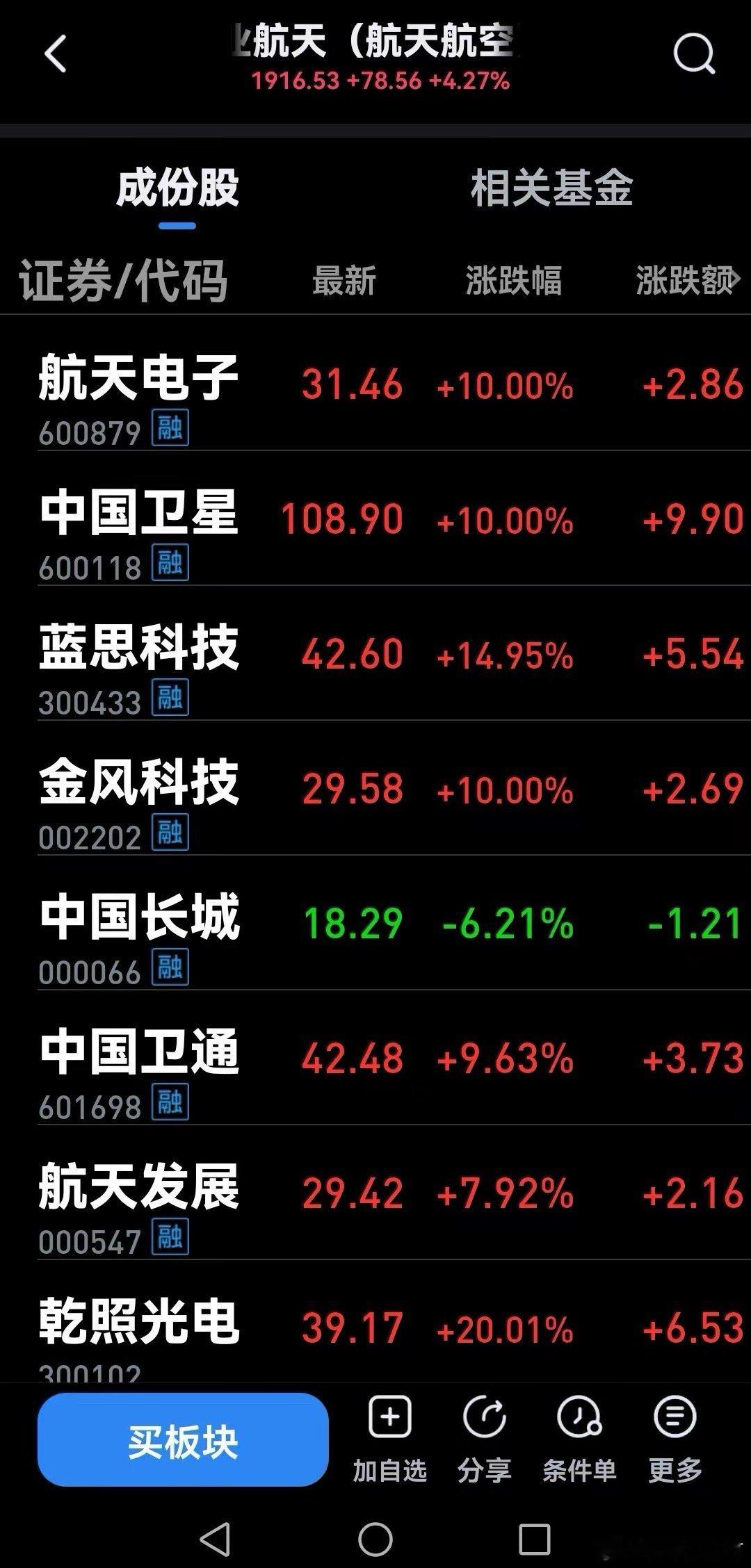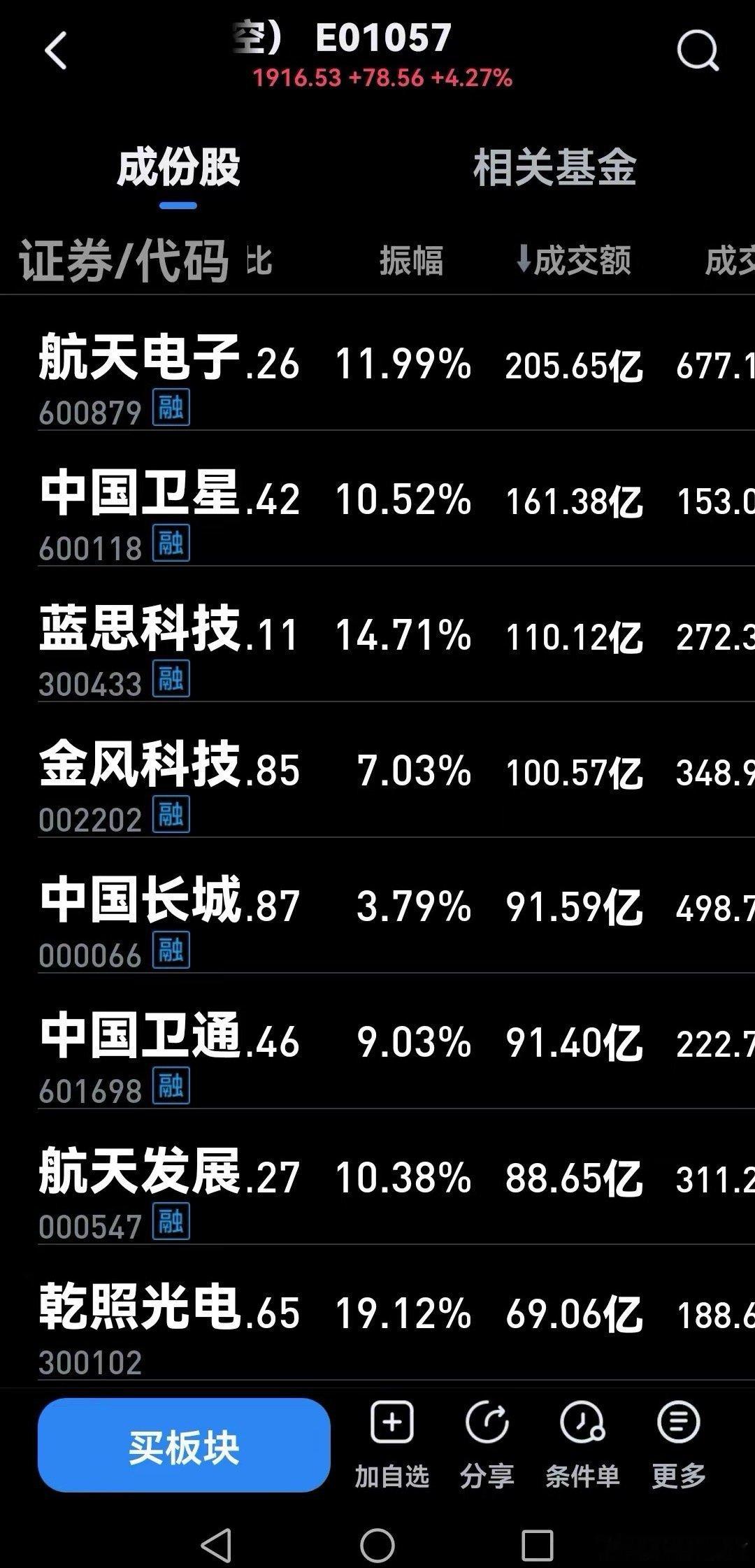 商业航天今日成交量最大的10家公司,只有1家股价下跌:1、航天电子 成交205.65亿 涨停2、中国卫星成交161.38亿 涨停3、蓝思科技 成交110.12亿 涨14.71亿4、金风科技 成交100.57亿 涨停5、中国长城成交91.59亿跌6.21%6、中国卫通成交91.40亿涨9.63%7、航天发展成交88.65亿涨7.92%8、乾照光电成交69.06亿涨停9、上海瀚讯成交62.42亿涨8.73%10、臻镭科技成交61.66亿涨停数据收集整理于炒股软件,仅供交流,不构成买卖依据。