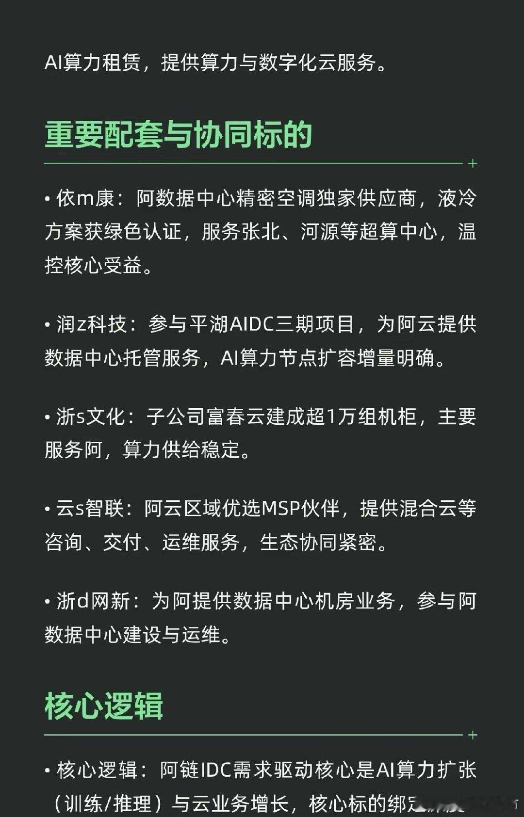 算力基建筑牢底座:阿里IDC产业链重塑数字未来随着AI大模型的爆发式增长,算力基建已成为数字经济的核心底座,阿里系IDC产业链的深度布局正是这一产业趋势的生动缩影。从核心绑定标的来看,数据港以超90%收入依赖阿里、十年期160亿合同筑牢核心供应地位,杭钢股份作为华东算力基地承接通义千问30%推理算力,润建股份则借东盟智算云项目推进出海布局;依米康、润和科技等配套企业则从温控、托管等维度完善生态,液冷技术、低PUE设计成为行业竞争关键。当前IDC行业正从“规模扩张”转向“技术升级+生态协同”,头部企业通过长期协议锁定需求,技术迭代推动绿色化、高效化转型,出海布局则打开增量空间。这一趋势不仅将加速算力基建的国产替代,推动IDC行业集中度提升,更将通过“算力-场景-生态”的闭环,支撑AI在各行业的深度渗透,为数字经济高质量发展筑牢底层根基。同时,产业链的深度绑定也将倒逼上下游企业加速技术创新,催生更多智能化解决方案,最终推动中国数字产业在全球竞争中占据更主动的地位。