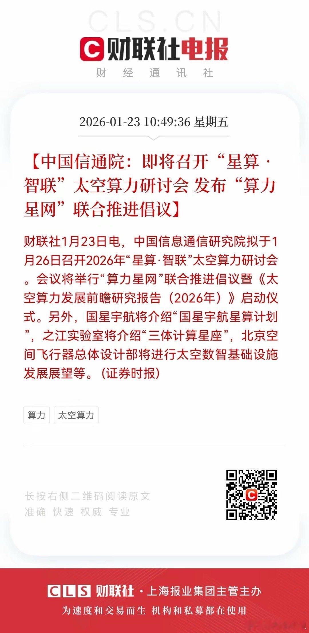 利好!重磅利好!太空算力引爆算力基建新赛道,“星算·智联”会议或成产业爆发前夜的号角在AI算力需求井喷的当下,一场由中国信通院主导的“星算·智联”太空算力研讨会,即将在1月26日成为点燃资本市场的新火种。这场会议不仅将发布“算力星网”联合推进倡议,更会启动《太空算力发展前瞻研究报告(2026年)》,直接推动算力基建从地面走向近地轨道,打开万亿级产业新空间。从投资角度看,太空算力是地面算力网络的终极补全方案。低轨卫星星座可突破光纤铺设的地理限制,实现全球无死角算力覆盖,尤其在海洋、荒漠等场景下,能满足自动驾驶、应急通信等刚需。随着国星宇航“星算计划”、之江实验室“三体计算星座”等项目落地,卫星制造、星上计算芯片、天地一体化通信等细分领域将迎来订单爆发。当前A股市场中,具备卫星整星制造能力的企业,以及掌握星载处理器、激光通信核心技术的公司,已成为资金提前布局的标的。此次会议释放的政策信号,将加速行业从“技术验证”向“商业落地”跨越,预计2026年将成为太空算力商业化元年。对投资者而言,这一主题兼具“硬科技壁垒”与“政策强催化”双重属性。建议重点关注两条主线:一是直接参与“算力星网”建设的卫星产业链龙头;二是提供星上计算芯片、边缘计算解决方案的核心供应商。随着会议临近,相关标的有望迎来估值与业绩的戴维斯双击,成为跨年行情中最具爆发力的成长主线之一。