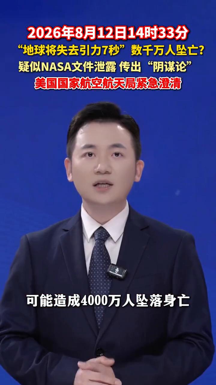 2026年8月12日14时33分,"地球将失去引力7秒"数千万人坠亡?疑似NASA文件泄露传出"阴谋论",美国国家航空航天局紧急澄清。 主播浩嘉。 2026年8月12日,地球将失去引力7秒或造成4000万人坠亡。一则阴谋论在国内外社交媒体上疯传,宣称2026年8月12日14时33分,地球将短暂失重,可能造成4000万人坠落身亡。甚至称NASA已投入890亿美元预算修建地下掩体应对灾难。 对此美国国家航空航天局紧急回应辟谣,强调该传言毫无科学依据。NASA官员证实当天确实有日食等天象,但不会对地球引力造成影响。