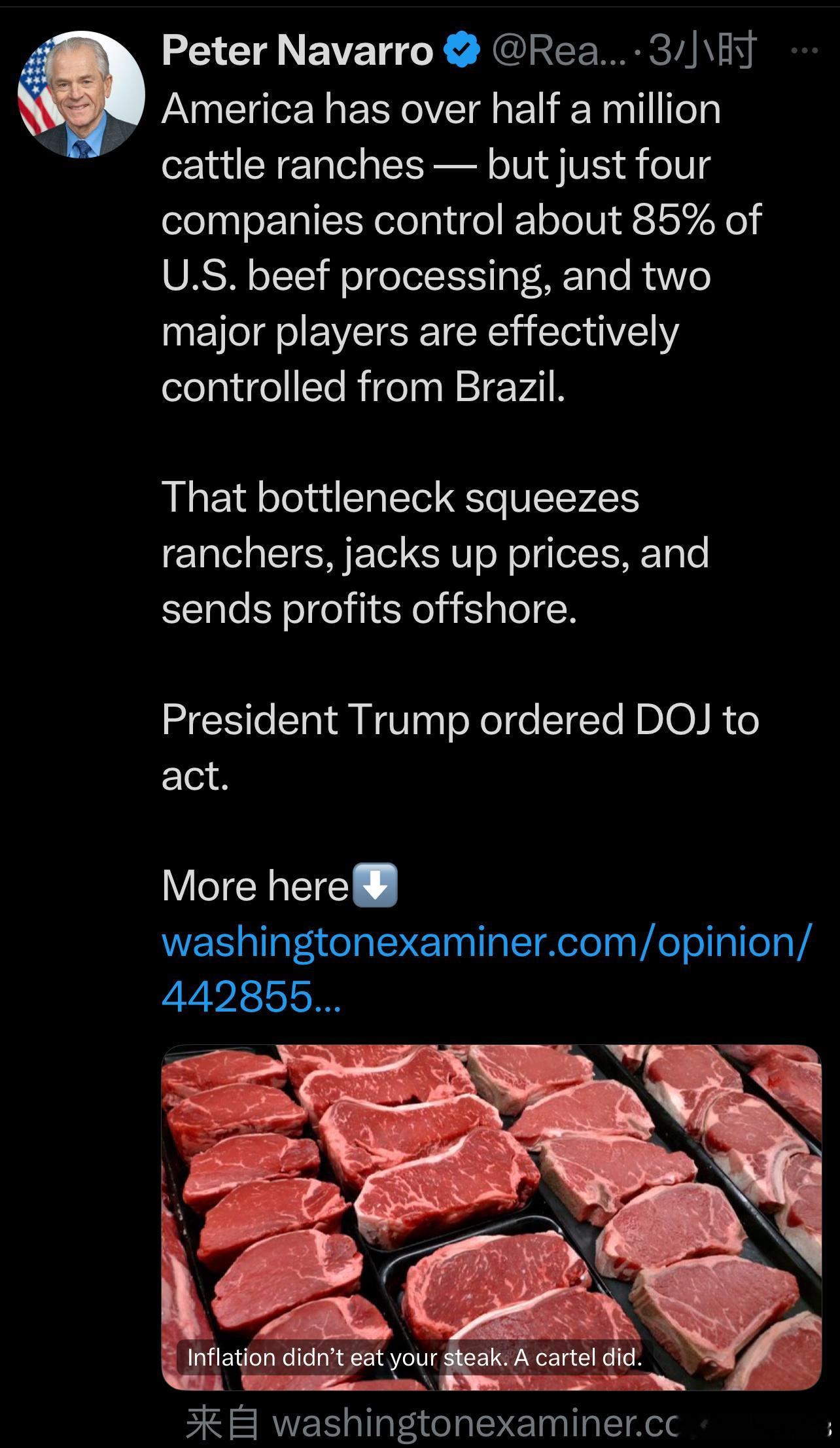 美国拥有超过 50 万个养牛场,但只有四家公司控制着美国约 85% 的牛肉加工,而其中两家主要企业实际上由巴西控制。这种瓶颈会挤压牧场主的利益,推高价格,并将利润转移到海外。川普总统已下令司法部采取行动。