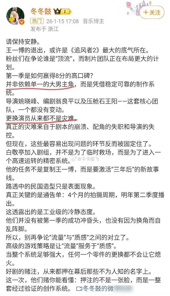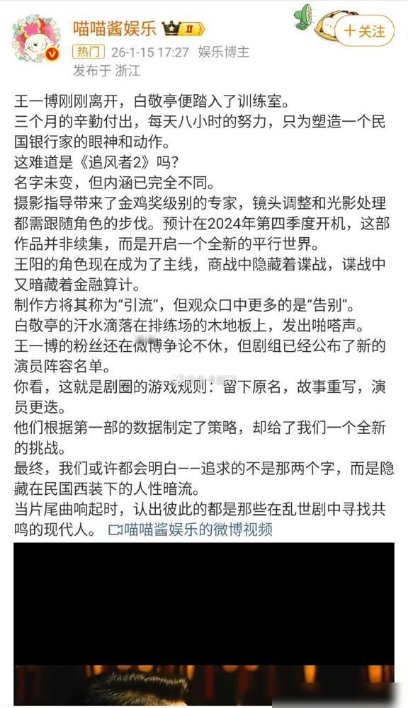 胡编乱造的文不对题的AI通稿(预计2024年四季度《追风者2》白敬亭入组开拍),现在已是2026年,可不是2024年,是不是该报飞天奖了,某些人及营销号又开始暗戳戳地拉踩人博了?给不给博报飞天奖,博帝在该剧的演技及为人都一等一的好。导演刘晓世说:“这部戏从选题到题材耽搁了好几年,直到王一博表示愿意接,才有投资人入场。正是因为王一博强大的招商能力及扛剧能力,才给投资方足够的信心,让观众提前见到了这部好剧”。那些闻风而动暗戳戳又来搞事拉踩王一博的,歇息去吧。傅东育层说,礼堂300多人掌声雷动给他的那个表演,就是对他演技最好的回答。某些人及营销号,再拉踩人家也没用,人家4提影帝又提视帝,获影视剧主流奖项及提名,远超你们这些AI文所捧的演员,拉踩博没用,博演技在观众心里