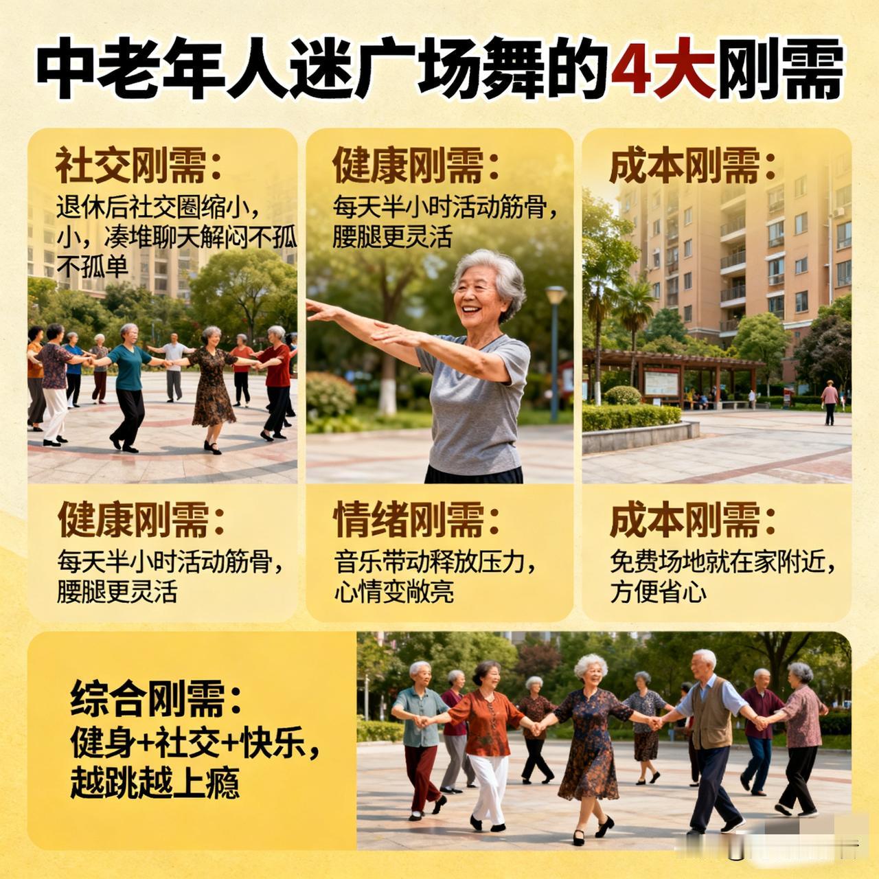 为啥中老年人这么迷广场舞?看完终于懂了 中老年人爱跳广场舞,不是闲得慌,是真刚需!退休后社交圈变小,广场舞能凑堆聊天,解闷又不孤单;每天跳半小时,活动筋骨、出出汗,比在家坐着强多了,腰腿都灵活;跟着音乐扭一扭,烦恼全抛脑后,心情也变敞亮;关键还不花钱,场地就在小区广场,方便又省心。既能健身又能社交,还能收获快乐,难怪大爷大妈们天天准时报到,越跳越上瘾!