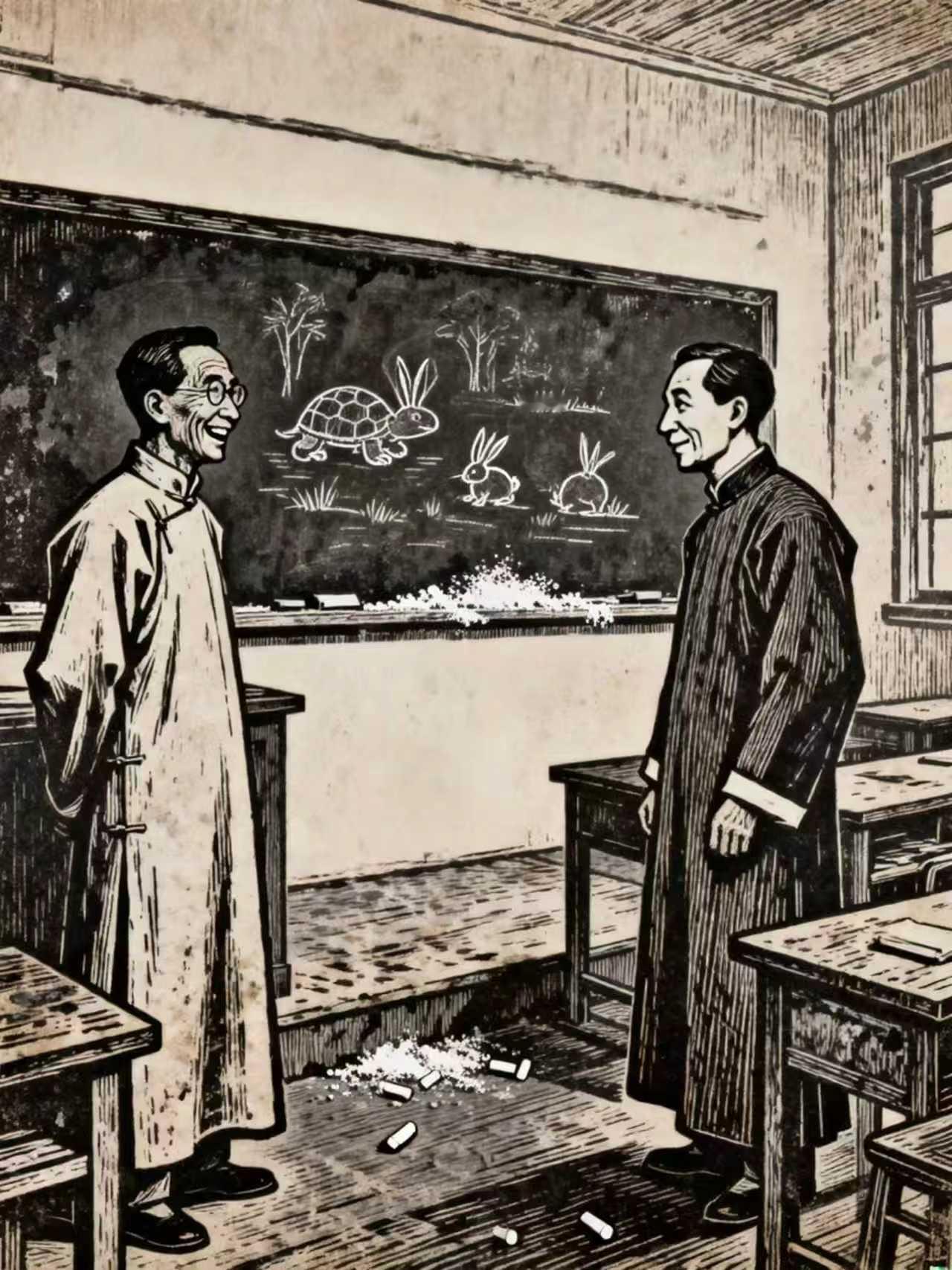 王铎:我的长篇小说《西镇》插图之四:闻一多与梁实秋看“龟兔赛跑”。